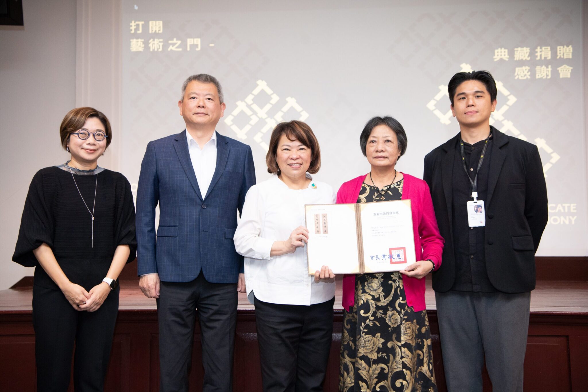 嘉義市立美術館於今(22)日舉辦「打開藝術之門——典藏捐贈感謝會」,共計11件珍貴藏品,由黃敏惠市長親自頒贈感謝狀,感謝故宮前副院長林柏亭、張六絃,李火炎、山口實、張瑞樑與張淑文六位典藏品捐贈者的無償提供藝術家林玉山,張義雄、朱芾亭、安西勘市、山口實、蕭進興與鄭建昌等珍貴典藏品,豐富美術館館藏資源,為嘉美館館藏注入深厚藝術能量。