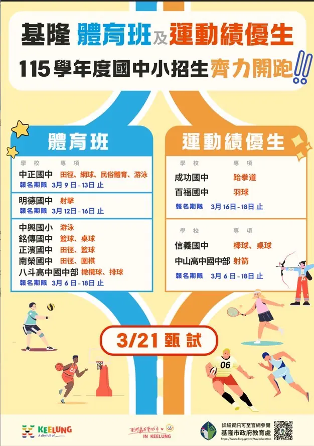 倒數321,你準備好了嗎? 基隆市115學年度國中小體育班暨運動績優生招生開跑,三月起受理報名,15種運動項目等你來挑戰。