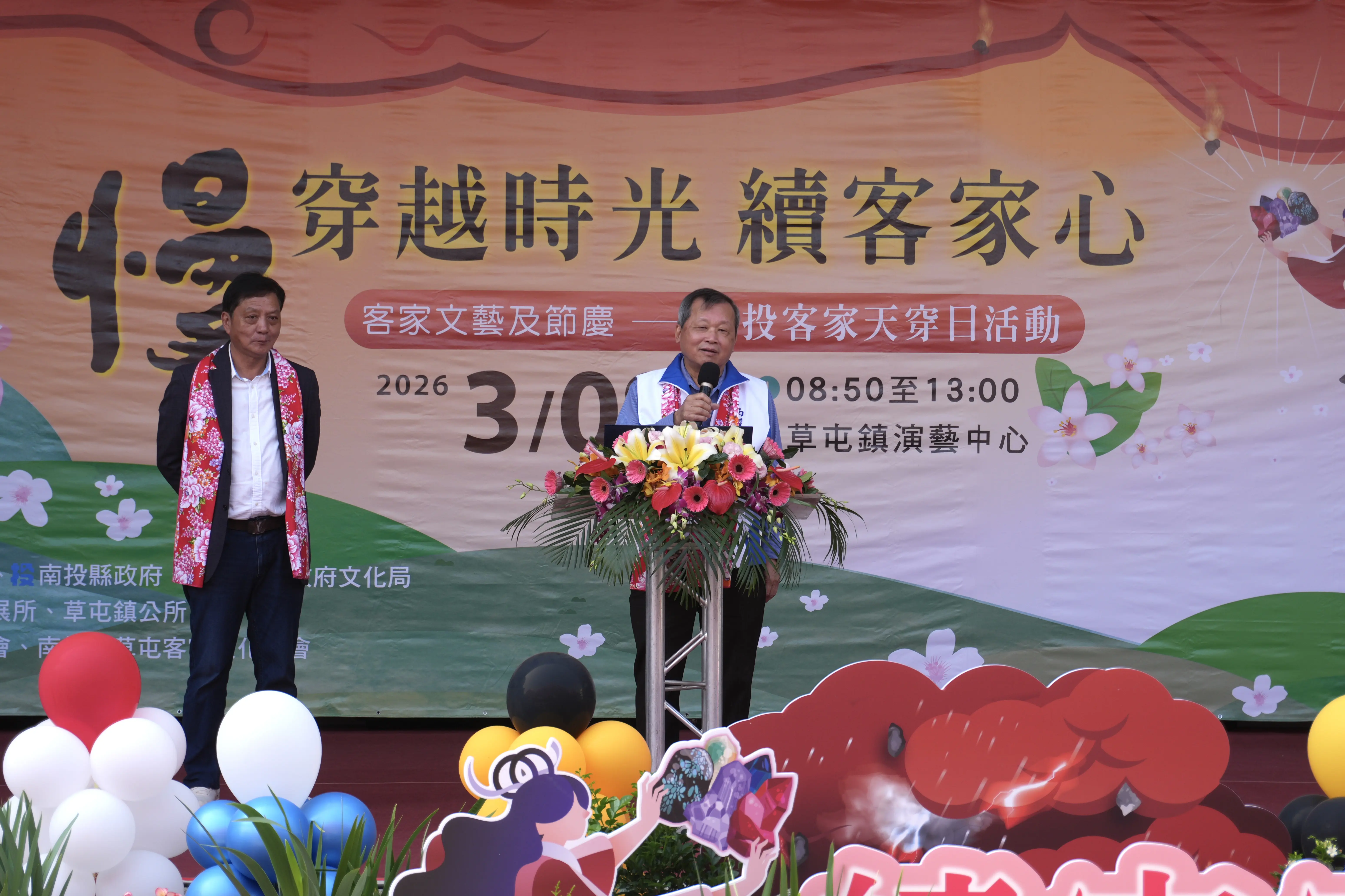 南投縣2026客家天穿日活動於8日上午在草屯鎮演藝中心熱鬧登場,南投縣客家協會及各鄉鎮市客家協會齊聚一堂,透過客家傳統「三獻禮」祭儀祈福、精采的藝文表演,以及DIY、客語闖關等活動,歡慶客家小過年,副縣長王瑞德致詞時期許,希望藉此能將珍貴的客家傳統文化傳承下去。