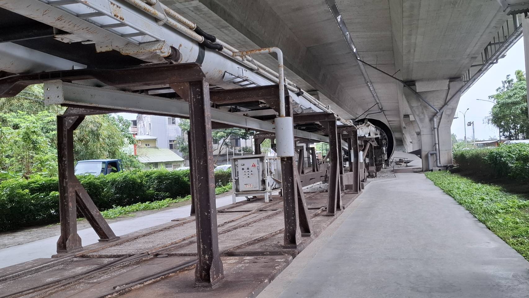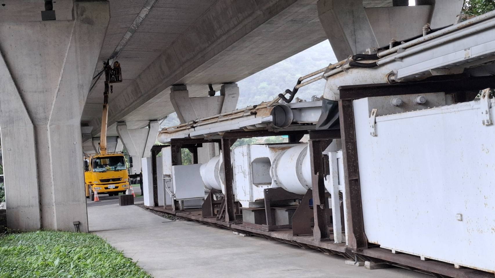 當年的交通部長林佳龍還親自主持開幕活動。事隔近4年多,疑上方的國5高架橋分隔島排水久未清除,雨水往下灌注,加上高公局未曾維護,鑽掘機已出現鏽蝕。