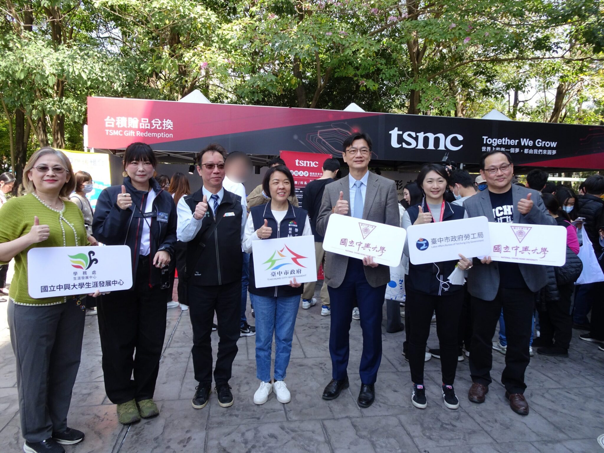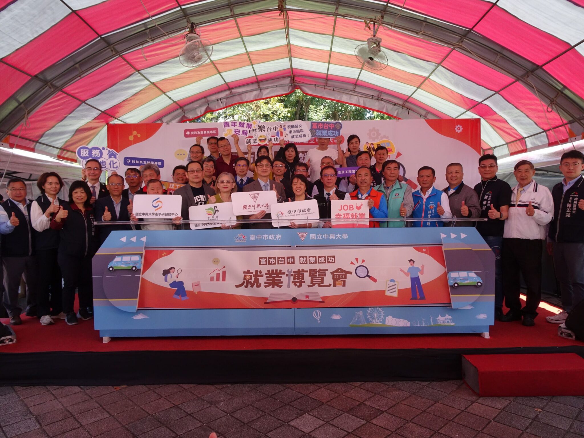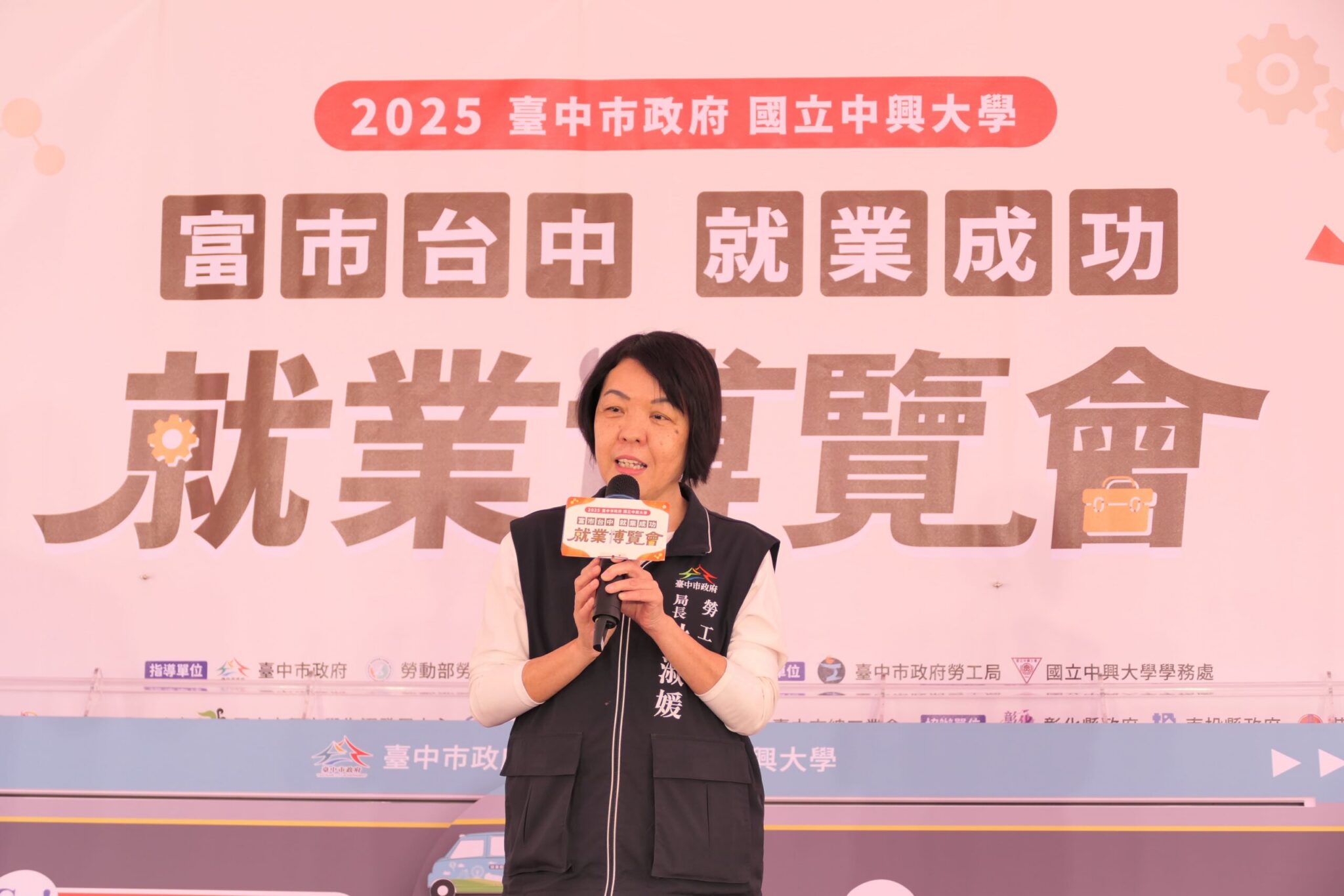 今日徵才活動包括勞工局長林淑媛、國立中興大學副校長張照勤、勞動部勞動力發展署中彰投分署副分署長阮啟釧、台灣總工會理事長花錦忠、台中市職業總工會理事長辛萬、台中直轄市總工會理事長曾木火、大台中職業總工會理事長林曾文財、台中市產業總工會理事長黃文峯、台灣勞工大聯盟總工會理事長賴天權、台中市總工會常務理事洪允鈞、中華民國就業服務商業同業公會全國聯合會理事長熊維舒、台灣勞工大聯盟總工會副理事長廖秀瑩、台灣科學園區科學工業同業公會中區辦事處處長賴明志、國軍退除役官兵輔導委員會台中市榮民服務處組長陳志成均到場。