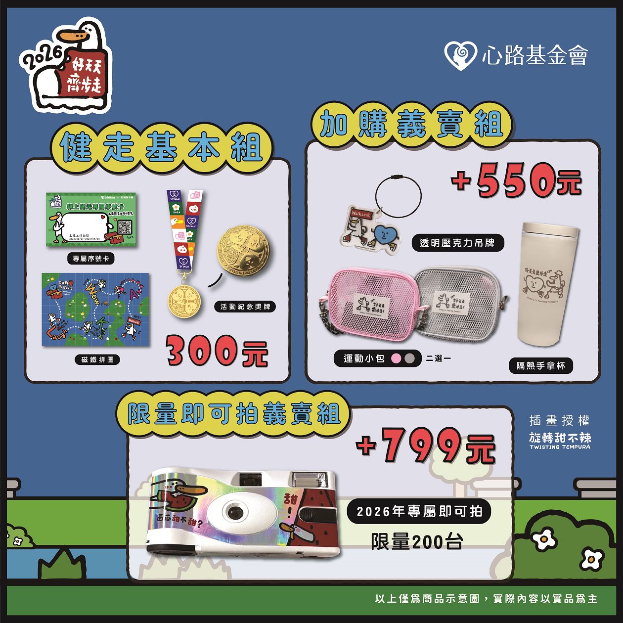 活動亮點之一為聯名紀念物資。凡報名健走即可獲得以「日子還是要過鴨」設計的紀念獎牌、運動小包、壓克力吊飾及隔熱手拿杯,另有限量200組即可拍。健走路線沿途也設置多處角色打卡立牌,民眾完成拍照上傳任務,還可兌換由悠遊卡公司贊助的《心路⨯旋轉甜不辣》限量公益聯名悠遊卡。