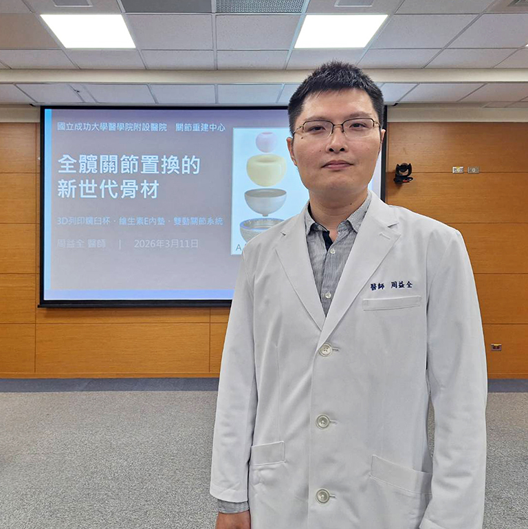 成大醫院關節重建中心持續關注關節重建材料與手術技術的發展趨勢,並結合臨床經驗與個別化評估,優化人工關節植入的選擇策略與照護流程。周益全醫師表示,人工髖關節置換不僅是「更換關節」,更是重建行動能力與生活品質的重要醫療環節。透過新世代骨材的靈活運用與完整的復健規劃,可望提升長期穩定度與功能表現,讓患者在安全基礎下恢復日常活動。