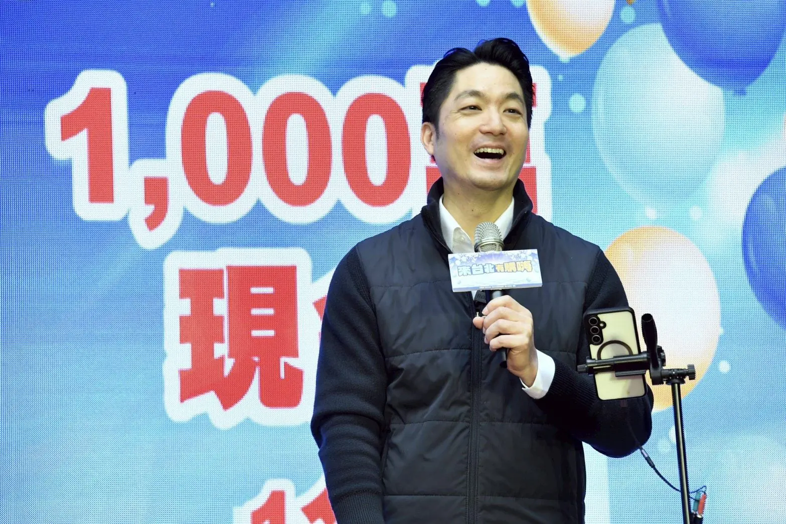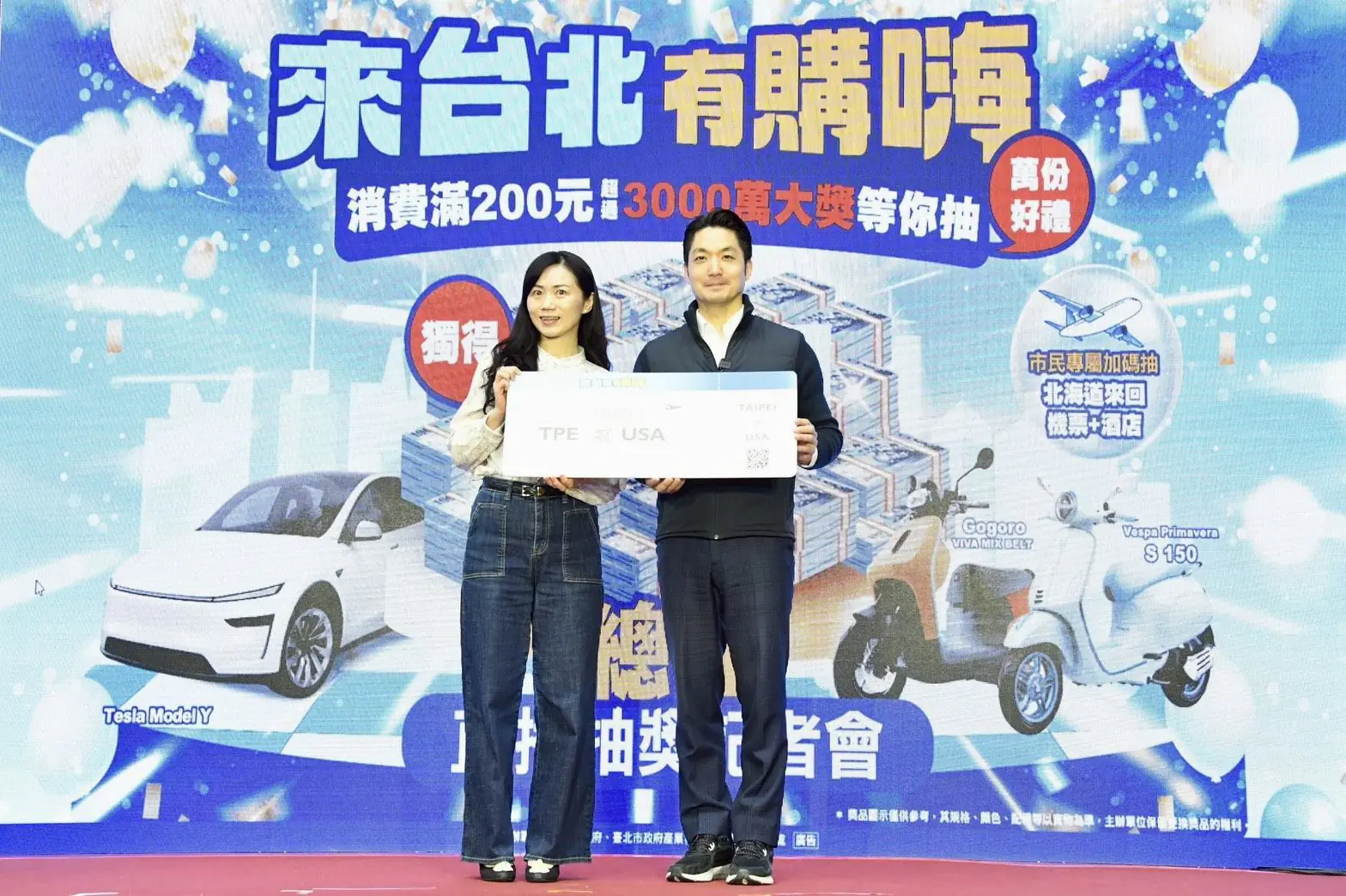 臺北市政府為響應中央普發現金政策,推出「來台北有購嗨 消費歡樂抽」活動,成功帶動消費熱潮,並將消費動能留在臺北。今(11)日舉行壓軸總抽獎記者會,在律師見證下,由臺北市長蔣萬安親自抽出眾所矚目的1,000萬元現金大獎及 Tesla Model Y 等夢幻獎項。此外,活動也特別針對臺北市民加碼送出北海道雙人機加酒套裝行程,為活動畫下圓滿句點。