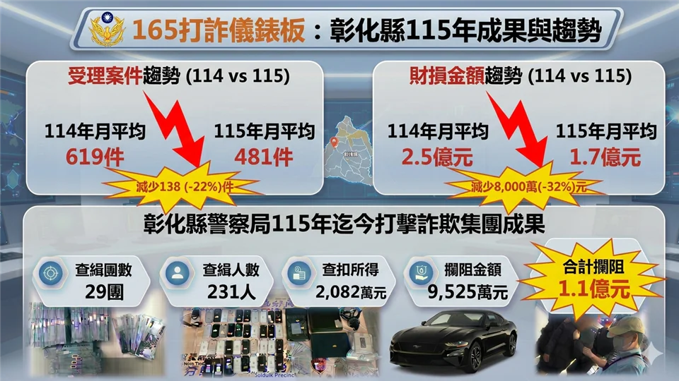 王縣長表示,依據警政署打詐儀錶板統計,彰化縣去(114)年度平均每月詐騙受理619件,財損2.5億元;115年迄今平均每月詐騙受理481件,財損1.7億元,平均每月受理件數減少138件(-22%)、財損減少8,000萬餘元(-32%),受理件數及財損金額均呈顯著下降趨勢。警察局於115年迄今累計查獲詐欺集團29團、犯嫌231人,查扣不法所得價值約2,082萬餘元;並攔阻詐騙9,525萬餘元,累計阻斷詐團金流突破1.1億元,查獲毒品案件人數 261 人,查獲毒品重量到 5528 克,查緝成果相當亮眼。