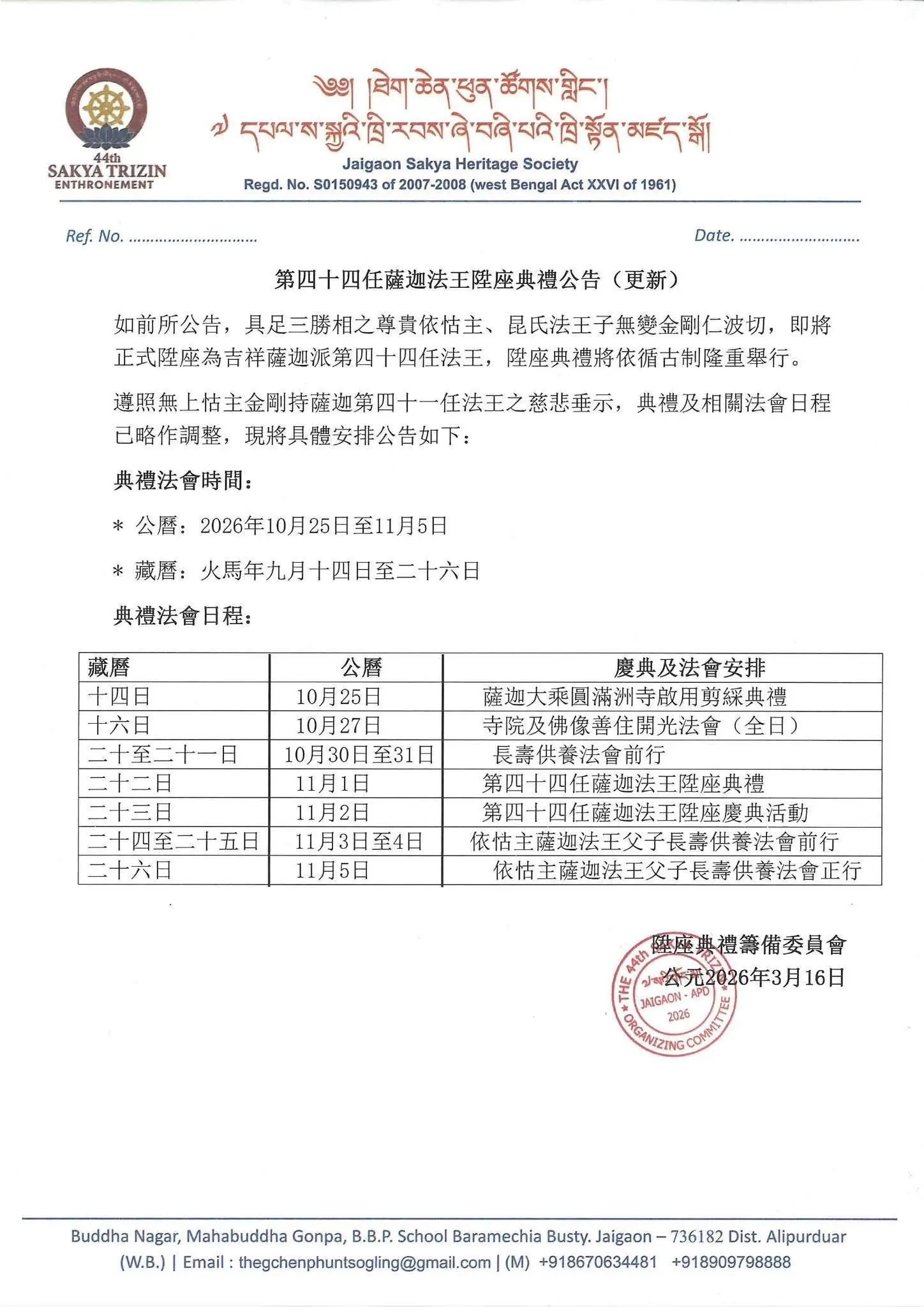 在全球藏傳佛教界矚目之下,薩迦傳承即將迎來重要歷史時刻。根據主辦單位於2026年3月16日發布之《第四十四任薩迦法王陞座典禮公告(更新)》,尊貴的法王子無變金剛仁波切(Avikrita Vajra Rinpoche),將於2026年10月25日至11月5日期間,在印度與不丹交界的佛教重鎮賈伊岡(Jaigaon)舉行系列法會與登基典禮,並於11月1日正式陞座為第44任薩迦法王。