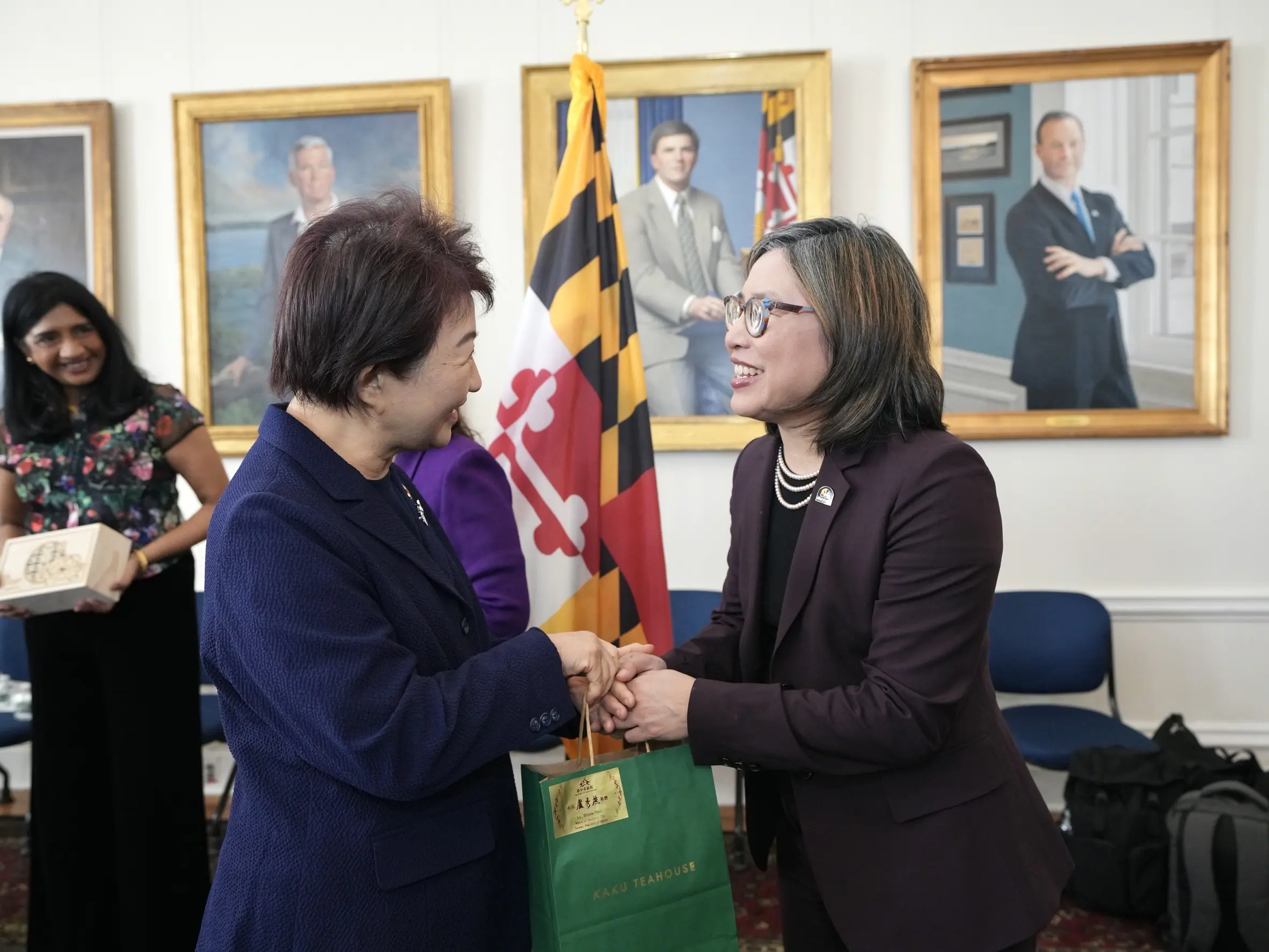 盧市長訪團拜會州府,包含馬里蘭州副州長米勒(Aruna Miller)、州務卿李鳳遷(Susan C. Lee)、勞工廳長吳俞蓉(Portia Wu)及商務廳副廳長里卡多·班(Ricardo Benn)等一行10多人熱情接待,雙方互動熱絡,其中勞工廳長吳俞蓉(Portia Wu)雙親來自彰化鹿港,讓這場拜會增添不少親切感。
