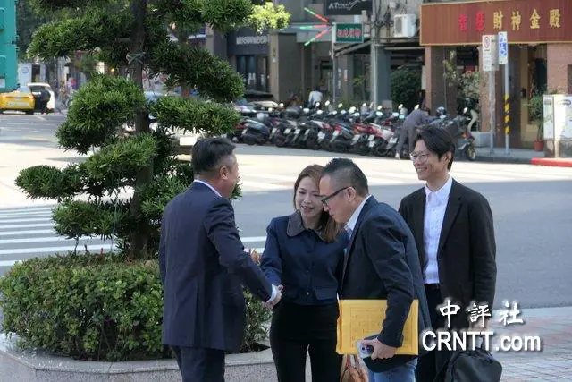台灣民眾黨秘書長周榆修率團隊到國民黨中央黨部談2026縣市長選舉藍白整合機制,國民黨副秘書長李哲華到門口迎接。(中評社)