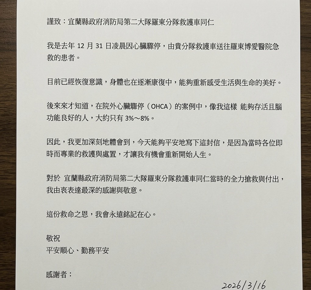 此篇文章最開始出處為: 心驟停患者康復出院 親遞感謝信致謝羅東消防救護英雄