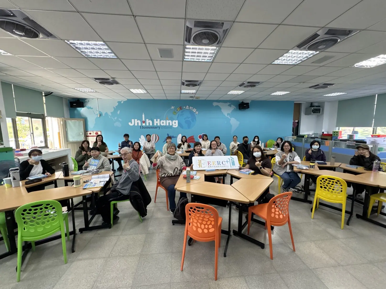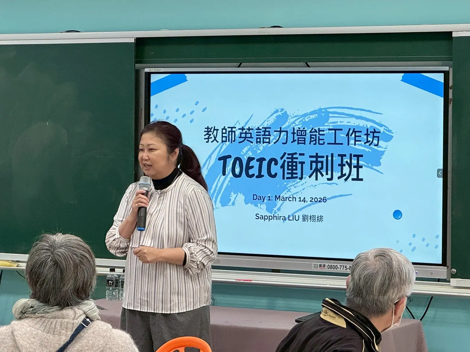 在志航國小多功能教室中,來自全市國中小之校長、主任及教師參與TOEIC共學課程,由專業講師引導強化聽說讀寫能力,協助學員突破既有程度。本課程為全市第2次辦理,學員參與動機多元,包含以通過B1或B2等級為目標者、期望重拾英語能力之教師,以及持續精進自我專業之教育人員,展現持續學習與自我提升之專業態度。
