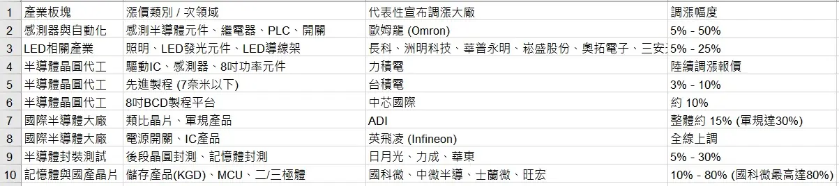 在感測半導體及自動化方面,日本大廠歐姆龍(Omron)也將感測半導體元件、繼電器、PLC等產品自即日起調漲5%至50%;晶圓代工廠力積電也已於年初調漲感測半導體元件與驅動IC的價格,8吋功率元件代工報價調。晶圓代工大廠台積電則宣布調漲7奈米以下先進製程3%至10%的價格,中芯國際則對8吋BCD製程平台調漲約10%。