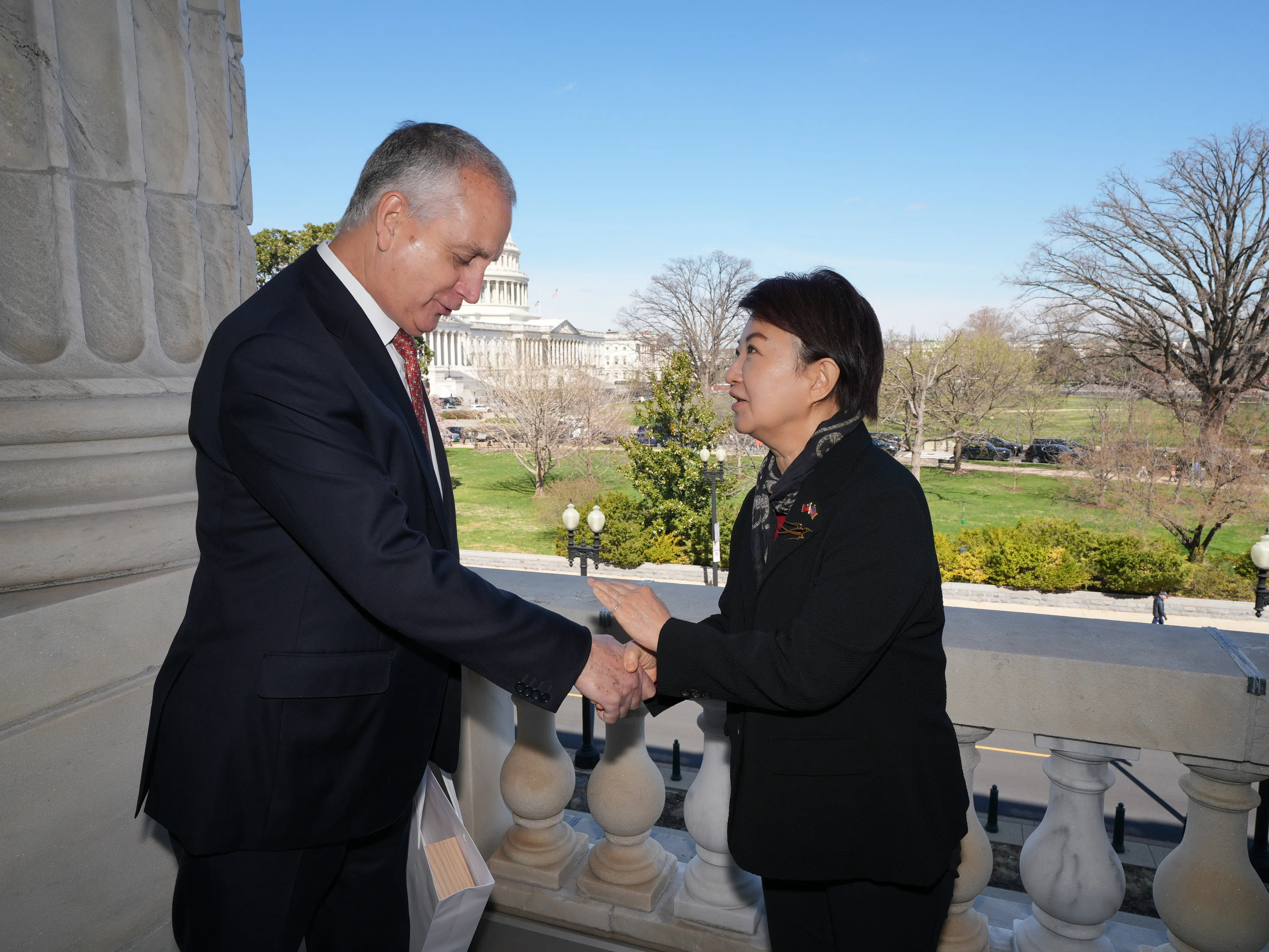 晤談結束後,應巴拉特主席之邀,雙方於辦公室外的窗台合影留念,以宏偉的國會大廈穹頂為背景,為這場堅實外交留下珍貴紀錄。