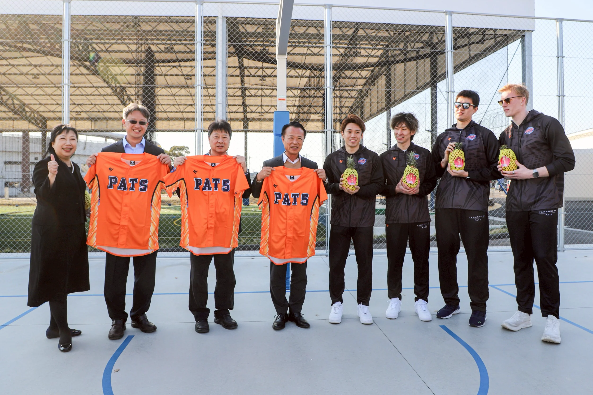 接著眾人前往山口縣宇部市俵田翁紀念體育館,與山口縣職業籃球隊「Yamaguchi Patsfive」交流,翁章梁親自向球員遞上鳳梨,為大家加油打氣,籃球隊則回贈紀念球衣。