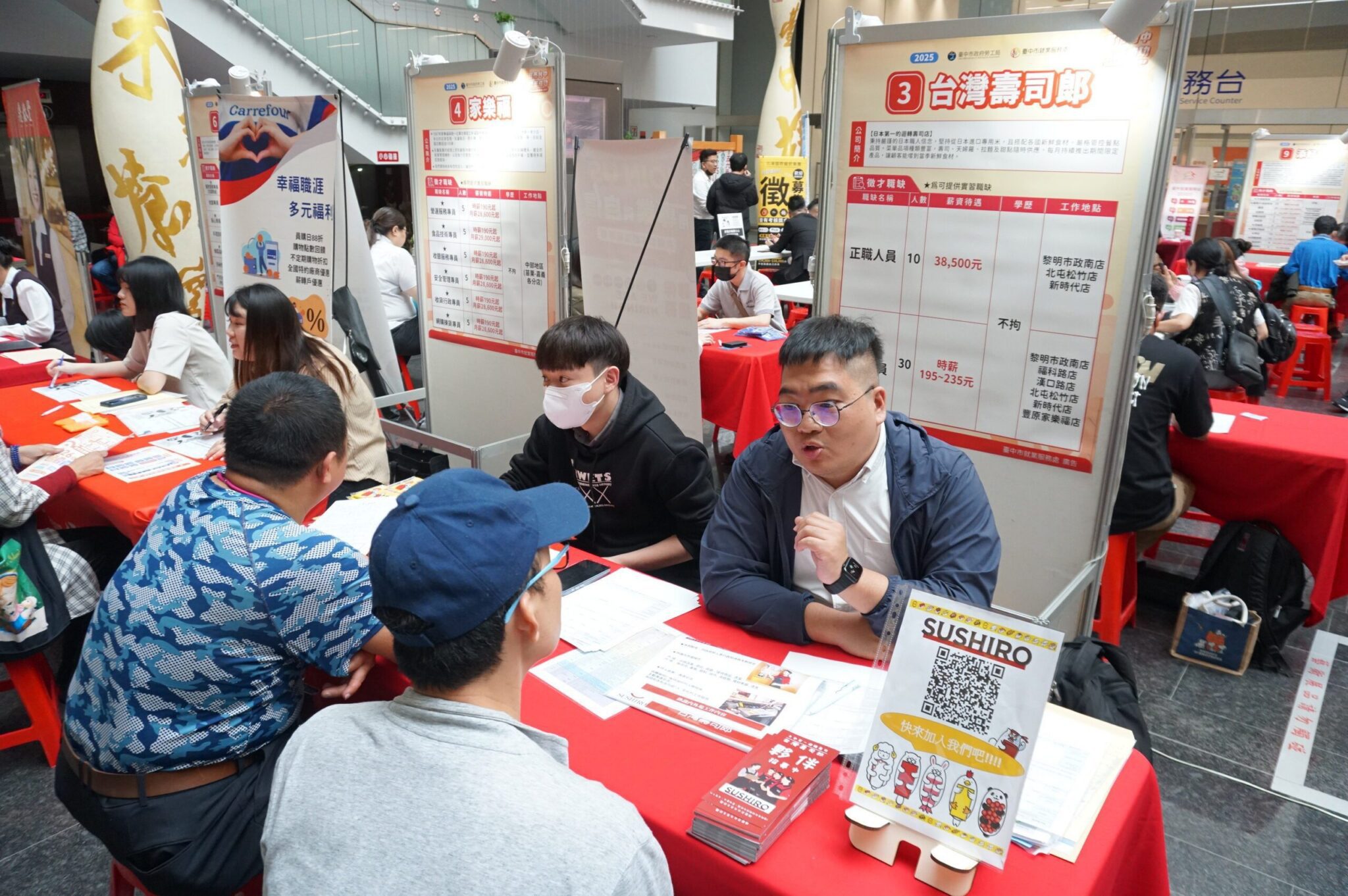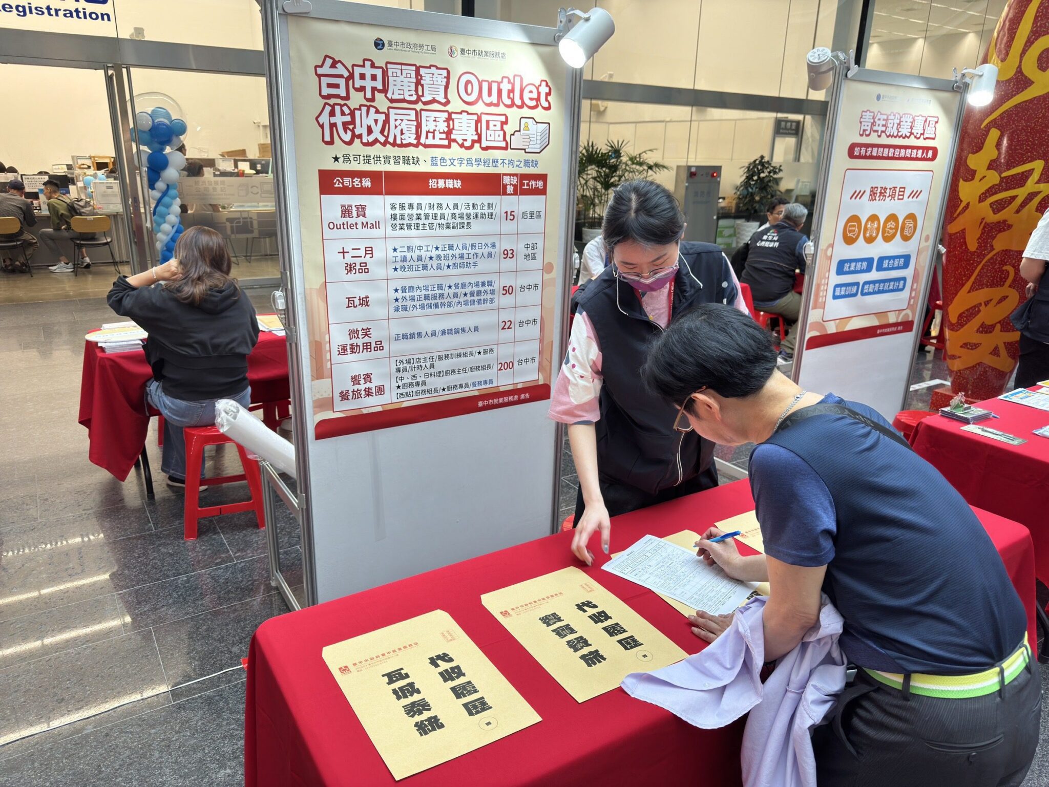 台中市政府勞工局昨(26)日下午,在市政府文心樓1樓辦理「富市台中 就業成功」百貨及服務業聯合徵才,邀請鼎泰豐、星巴克、GIORDANO、集雅社、添好運等知名企業,並設置麗寶Outlet Mall、三井Outlet Mall及旗下設櫃品牌代收履歷專區,共計26家廠商,釋出1,400個職缺,吸引超過300位求職者參與,初步媒合率達6成。