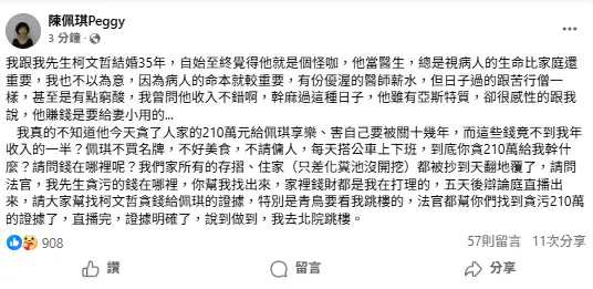 綜合報導/台灣民眾黨前主席柯文哲涉京華城等案,台北地方法院26日判決有期徒刑17年、褫奪公權6年,可上訴。場外支持者群情激憤,柯文哲妻子陳佩琪原本也有登記旁聽證,並未到場。事後她在臉書發文聲稱,她要去台北地方法院跳樓。 據指出,陳佩琪赴日本參加兒子柯傅堯東京大學博士畢業典禮,尚未回台。 陳佩琪發文表示,她跟柯文哲結婚35年,自始至終覺得他就是個怪咖,他當醫生,總是視病人的生命比家庭還重要。她並不以為意,因為病人的命本就較重要,有份優渥的醫師薪水,但日子過的跟苦行僧一樣,甚至是有點窮酸。 陳佩琪說,她曾問柯收入不錯,幹麻過這種日子,他雖有亞斯特質,卻很感性的說,他賺錢是要給妻小用的… ![]() 陳佩琪表示,我真的不知道他今天貪了人家的210萬元給佩琪享樂、害自己要被關十幾年,而這些錢竟不到我年收入的一半?佩琪不買名牌,不好美食,不請傭人,每天搭公車上下班,到底你貪210萬給我幹什麼?請問錢在哪裡呢? 陳佩琪說,我們家所有的存摺、住家(只差化糞池沒開挖)都被抄到天翻地覆了,請問法官,我先生貪污的錢在哪裡,你幫我找出來,家裡錢財都是我在打理的,五天後辯論庭直播出來,請大家幫找柯文哲貪錢給佩琪的證據,特別是青鳥要看我跳樓的,法官都幫你們找到貪污210萬的證據了,直播完,證據明確了,說到做到,我去北院跳樓。 |