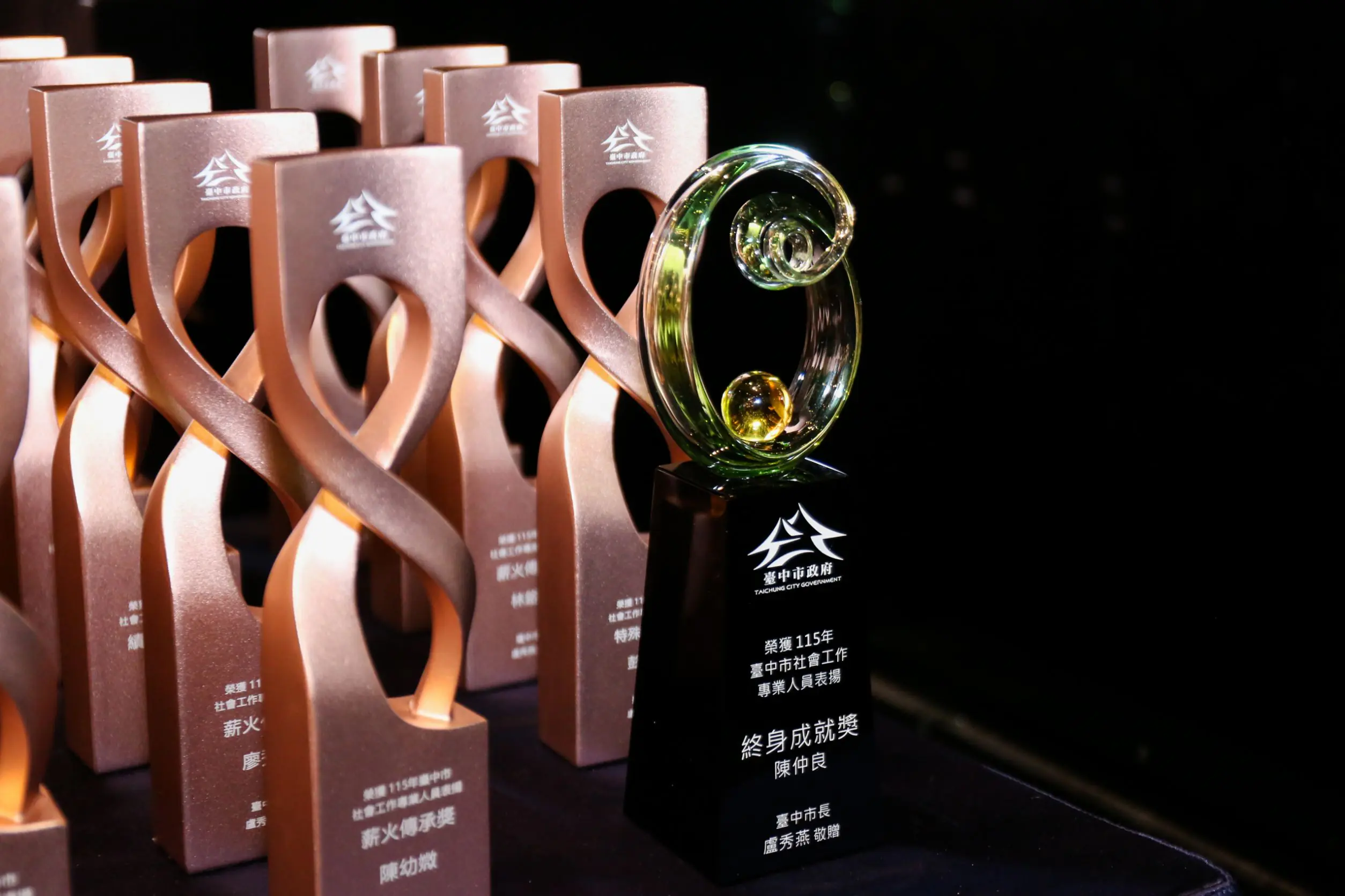 林副局長指出,今年典禮主題為「結起故事,繫起明天」,象徵社工串起交織連結的生命故事,為困境中的家庭帶來方向與希望。為呼應今年主題精神,本次典禮獎座以「結帶」與「交織」為設計概念,透過環繞交織的造型意象,展現社工在不同領域中彼此支持、共同守護社會的力量。典禮開場特別安排沙畫演出,描繪社工的服務點滴,以及陪伴民眾跨越困境的過程。