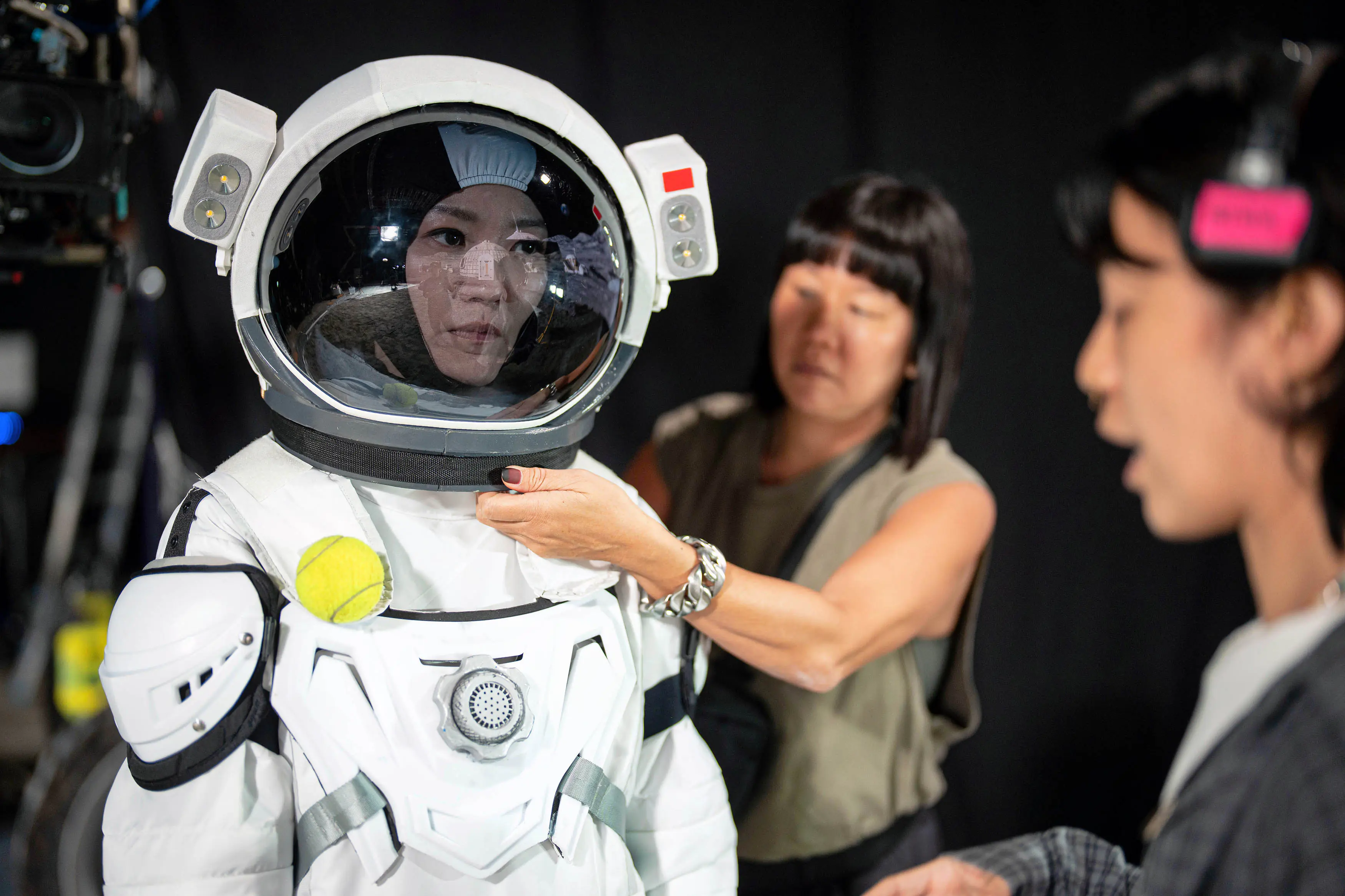 而拍攝過程也很硬,蔡淳佳首次穿上量身訂製的太空服吊鋼絲,百分百真實體驗「失重感」;林倛玉則在虛擬環境中對抗火星極端氣候。服裝內建風扇散熱、頭盔內藏補光,每個細節都為了讓畫面更真實、更好看。
