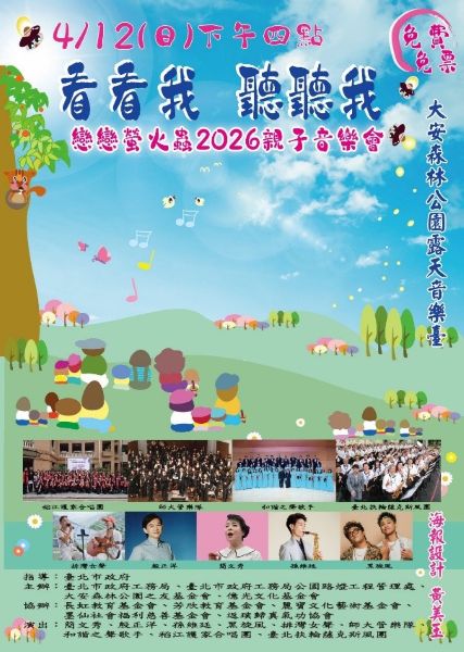 在臺北市政府努力下,成功讓原應不屬於都市的螢火蟲重現在都市綠洲,4月是臺北市的螢火蟲季,臺北市工務局暨公園路燈工程管理處、大安森林公園之友基金會、億光文化基金會12(日)下午4點在大安森林公園舉辦「看看我 聽聽我」親子音樂會,為大家帶來舒心的春暖午後。