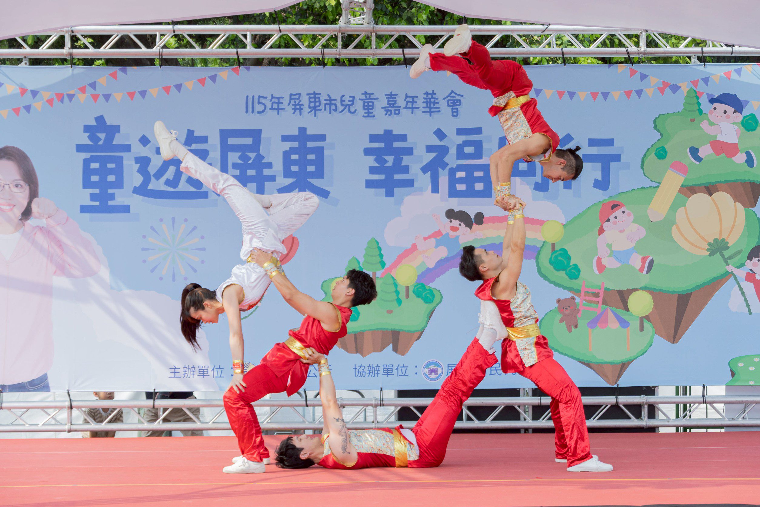 屏東嘉年華舞台活動於今日下午 3 點盛大登場,由「博逗兄弟」帶動氣氛拉開序幕。本次亮點包括屏東市 21 所國小及幼兒園團隊的才藝輪演,成功吸引大批民眾圍觀。節目規劃豐富多元,涵蓋小丑互動秀、動物舞蹈及萱萱老師的互動劇場。活動最高潮出現在人氣偶像「哈密瓜哥哥」與「果凍姐姐」上台之際,全場小朋友隨節奏載歌載舞,場面壯觀。整場舞台表演在溫馨且熱烈的氣氛中圓滿落幕,展現了嘉年華繽紛的生命力。