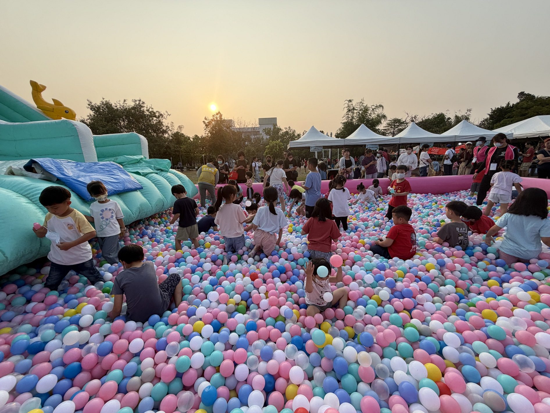 除了體能挑戰,靜態的「童心手作派對」同樣精采。透過雪花泥畫與手作證件套的教學,孩子們在專業老師的引導下,發揮天馬行空的想像力,親手將美學融入生活小物。而現場設置的超大型溜滑梯球池,更是孩子們的電力燃燒區,此起彼落的驚呼聲與歡笑聲,為千禧公園注入了滿滿的純真活力。