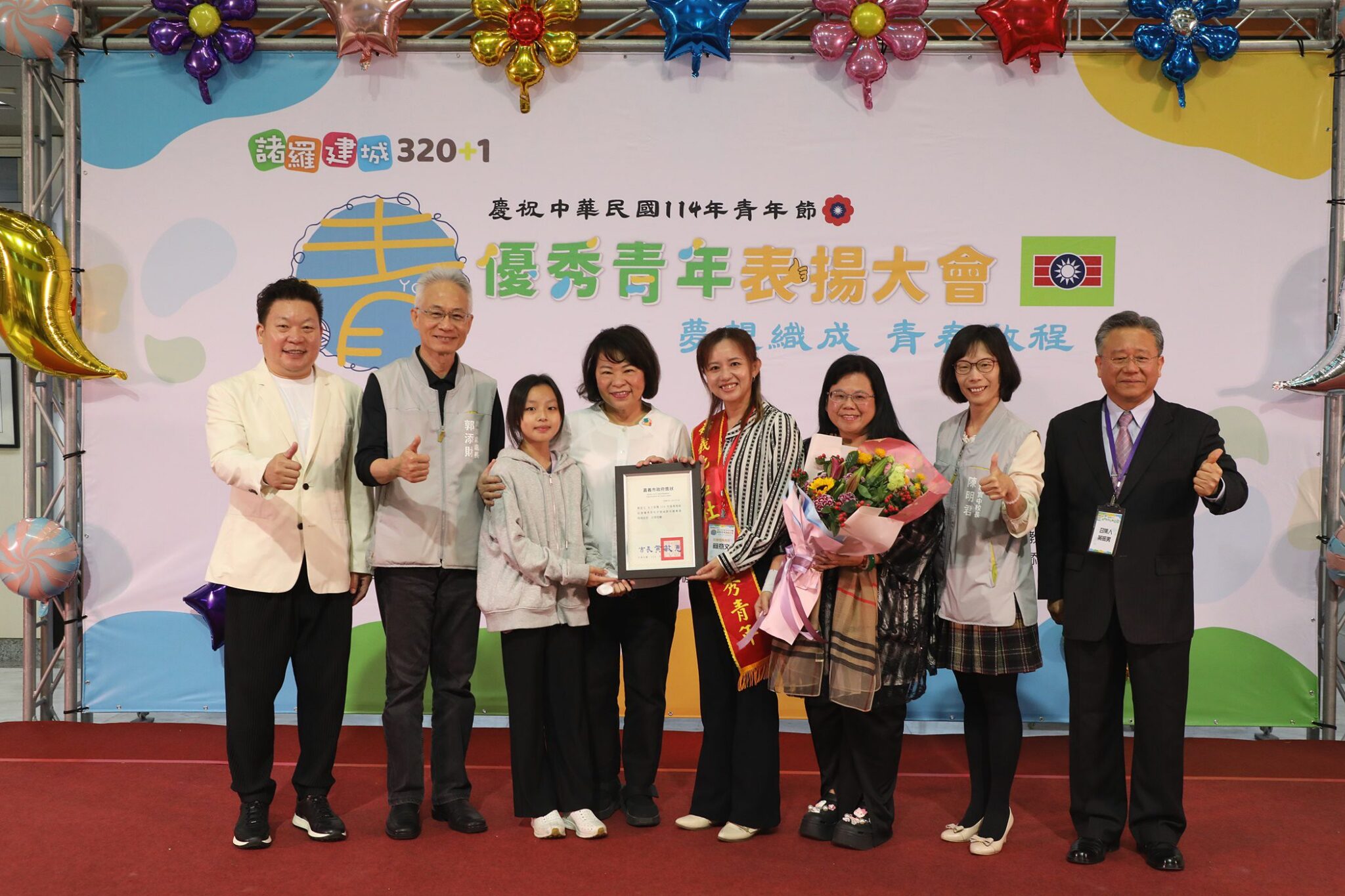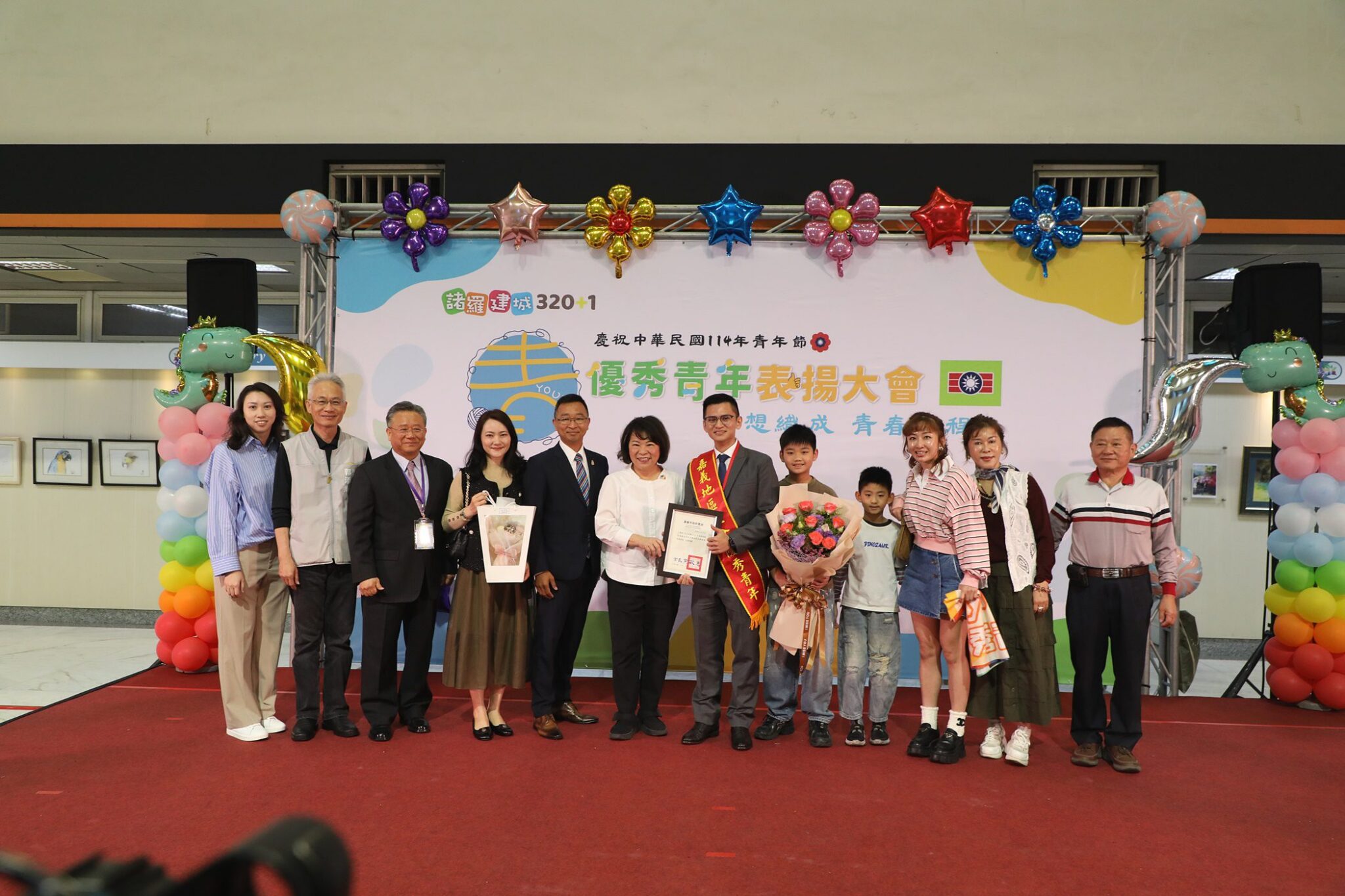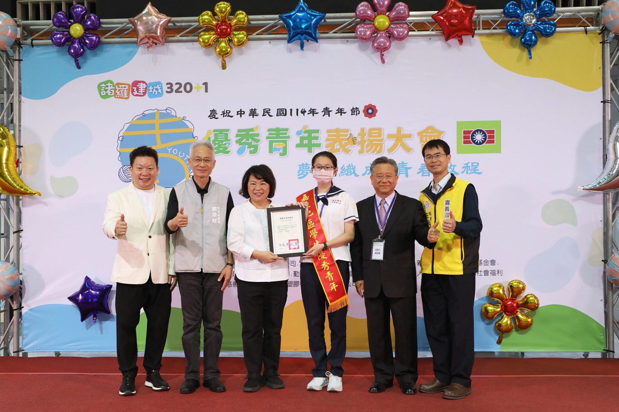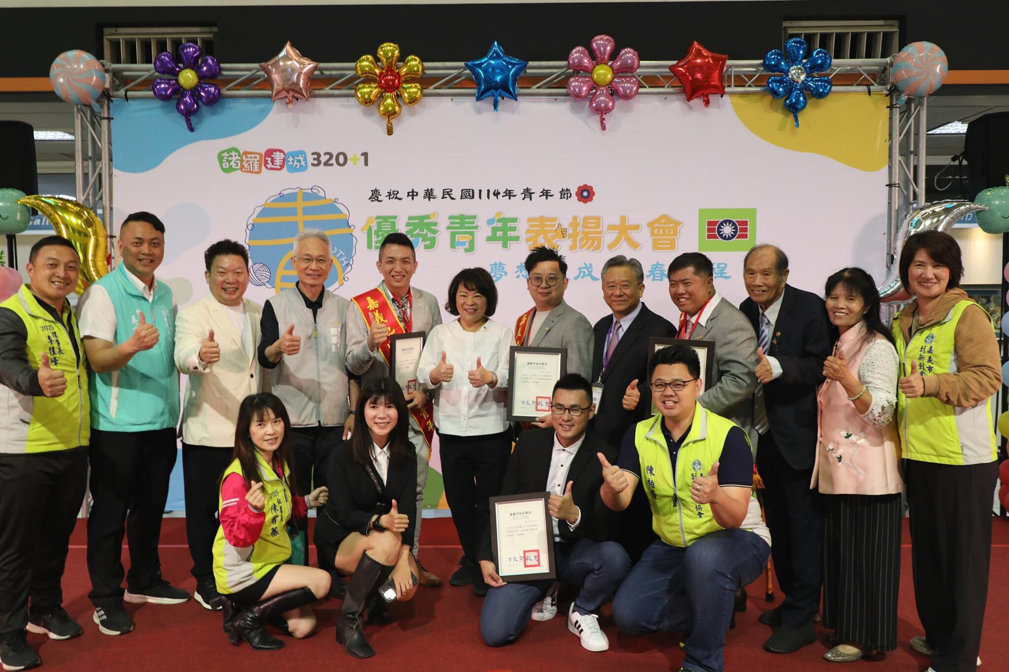114年嘉義地區慶祝青年節優秀青年表揚大會於今(29)日假嘉義市政府1樓中庭辦理,以「夢想織成、青春啟程」為主題。現場活動氛圍洋溢青春、充滿活力,有來自社會優秀青年、嘉義地區各大專院校、中等學校優秀青年等共計92位獲獎,市長黃敏惠到場頒發獎狀予獲獎者,並鼓勵大家勇敢逐夢,跳脫框架,為自己及社會開創更美好的世代。