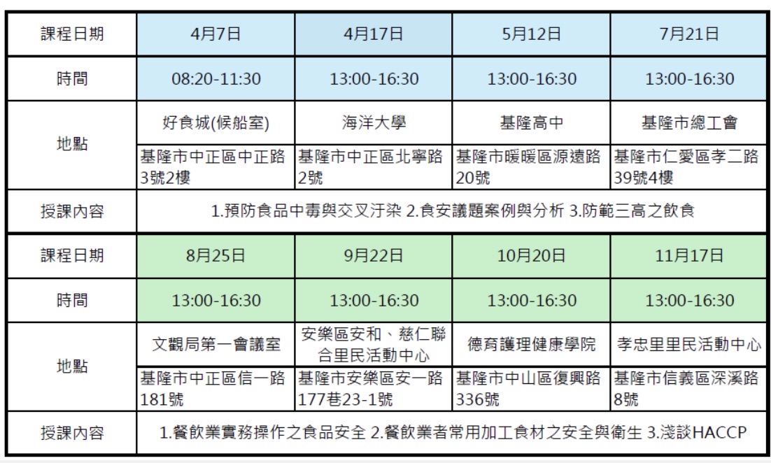 張賢政說明,為提升學習便利性,本年度講習採取「全市分區辦理」模式,預計每月巡迴各行政區,讓基隆七區業者都能就近參與。後續場次將於4/17、5/12、7/21、8/25、9/22、10/20及11/17陸續展開。食安從預防做起,衛生局將持續與餐飲業者攜手密切合作,創造基隆市民、餐飲業者、政府三贏 。並呼籲業者踴躍加入,共同為基隆創造高品質的美食之都。相關資訊請至基隆市衛生局官網查詢:https://www.klchb.klcg.gov.tw/tw/klchb/1361-313800.html