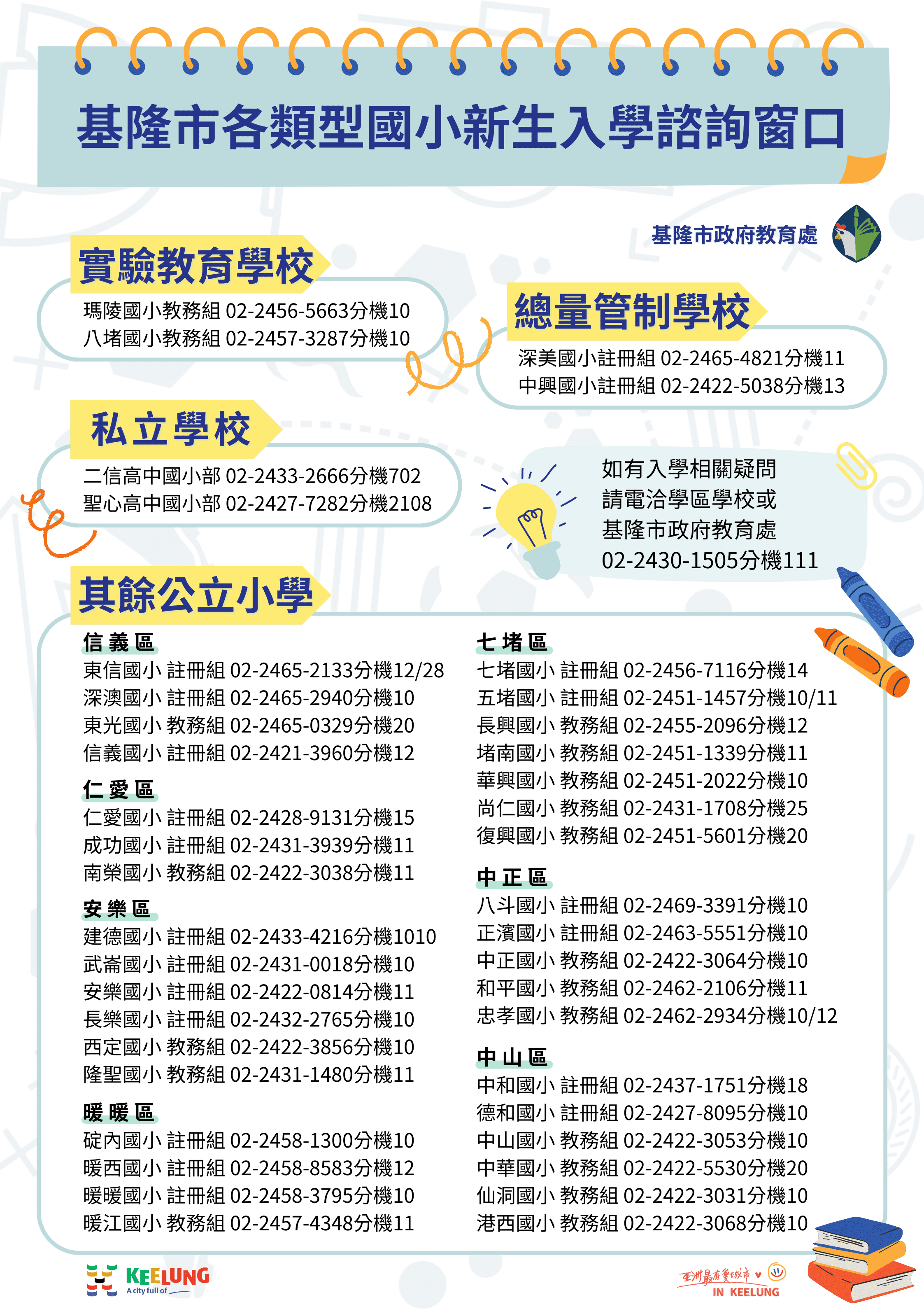 基隆市政府教育處長徐嬿立表示,提醒家長請事先參閱新生入學通知單與戶籍地學區學校公告,進行新生報到作業,如有其它新生入學疑問,歡迎洽詢戶籍地學區學校詢問新生報到相關事宜;如有學生被拒絕登記,可在現場向督導人員或打電話到教育處反應,聯絡電話:(02)24301505分機111。