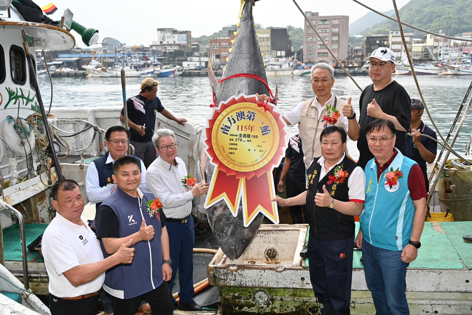 今年第一「鮪」在大家引領企盼中,「全昌隆168號」於2026年又再次拔得頭籌。船長林宜俊捕獲重約276公斤的黑鮪魚,代理縣長林茂盛11日親自主持拍賣會,在林茂盛及蘇澳區漁會賣力加油、打氣之下,各個承銷人熱烈的競標,最後由主持人宣布,由「三多屋」以每公斤7,200元高價得標。這尾今年南方澳第三魚貨拍賣場的「第一鮪」總重276公斤,總價達1,987,200元。這也是三多屋連續第五年成功奪魁,寫下「五連霸」紀錄。第一「鮪」榮銜為漁船主帶來一個好采頭,期待「全昌隆168號」三連霸運氣綿延給予蘇澳地區的漁友及黑鮪季帶來大豐收。