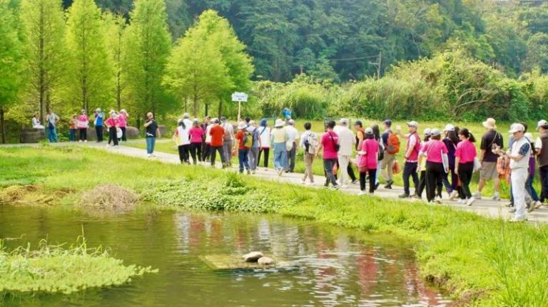 今日健走路線2.4公里,張禹斌副署長與醫院醫療服務審查執行會北區分會翁順隆主委、北區醫院院長聯誼會、西醫、中醫、牙醫師公會及職業總工會理事長等貴賓,引領民眾向前行,沿途經大溪月眉溼地生態公園落羽松大道、山豬湖親水園區及中庄吊橋,安排專人生態導覽,讓民眾除欣賞風景優美,也認識溼地多元生態,獲得民眾讚聲連連。