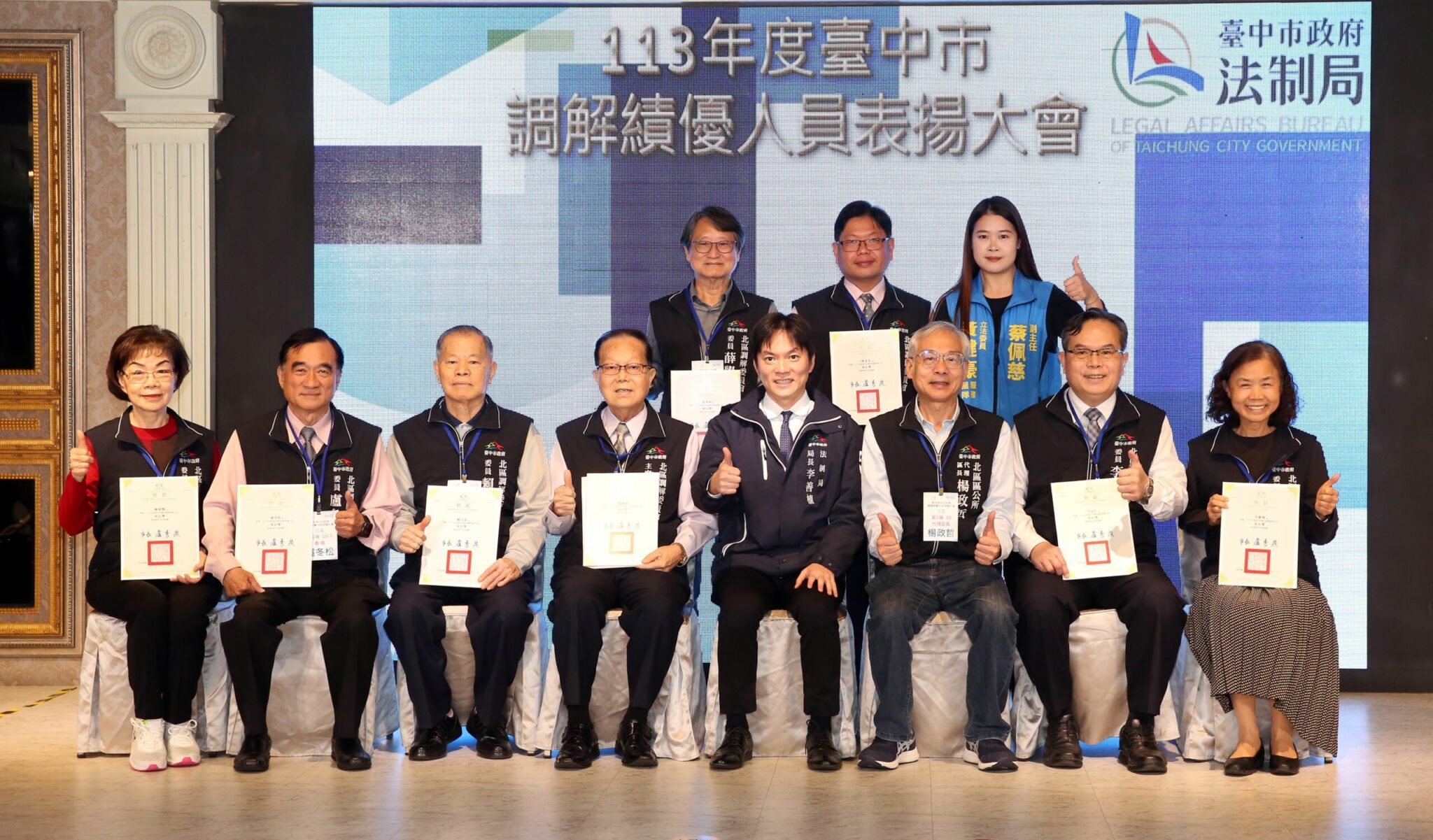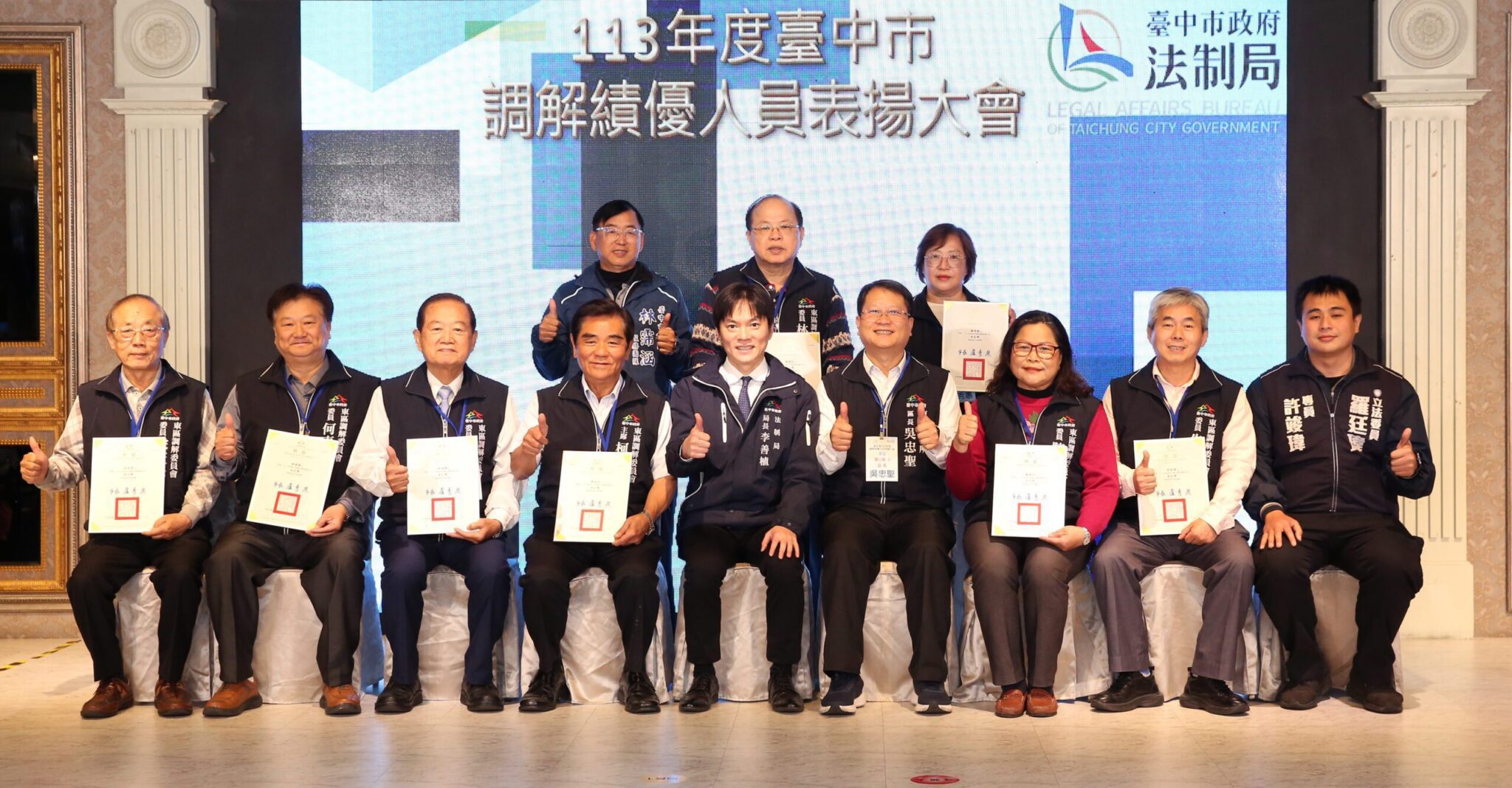 法制局說明,今年總共有482名獲獎人接受表揚,分別為榮獲113年獨任調解行政院長獎市長感謝狀2名、獨任調解市長獎231名、領導有方市長獎 29名、優良服務市長獎23名、協同調解市長獎1名、轉介調解市長獎190名、服務年資(滿12年)市長獎3名及績優調解行政人員市長獎3名。市府期透過此次表揚活動,感謝調解人員的辛勤付出,並持續提升調解服務品質,讓台中市成為更加和諧宜居的城市。