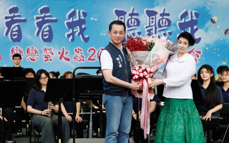 ▲臺北市政府林士斌副秘書長獻花給製作人聲樂家簡文秀。(圖/鍾尚軒)