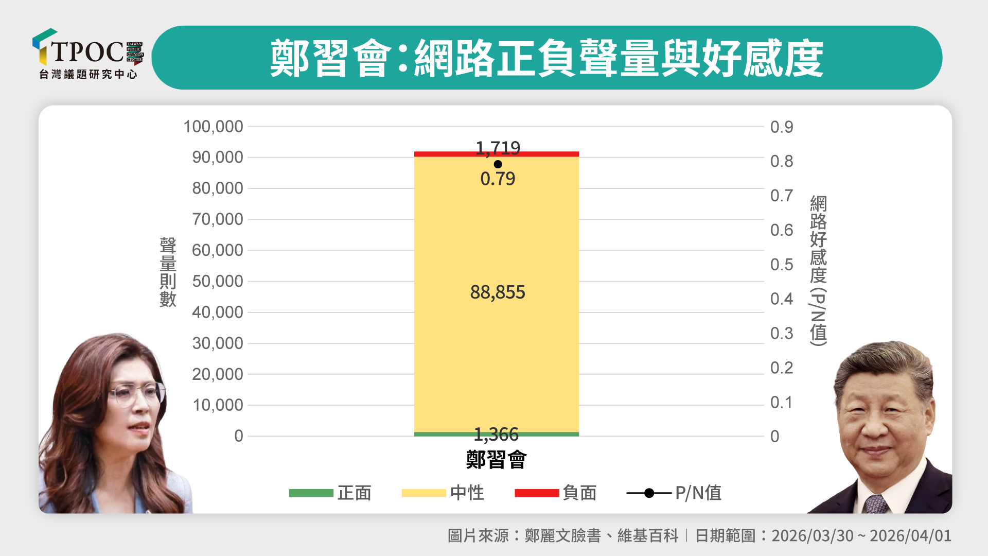 根據 TPOC 台灣議題研究中心透過 QuickseeK 快析輿情資料庫的數據顯示,鄭麗文出訪中國大陸的消息曝光之後,「鄭習會」相關討論的網路好感度(P/N 值)落在 0.79。觀察數據組成可以發現,中性聲量高達 88,855 則,佔據9成5以上的聲量,顯示社會大眾目前多抱持「觀望」態度。進一步分析熱門文章留言發現,正向與中性評論主要集中於對「避戰」與「和平相處」的具體訴求。網友留言包括「我們要和平不要戰爭」、「兩岸和平相處…沒什麼深仇大恨不能坐下來談的」。