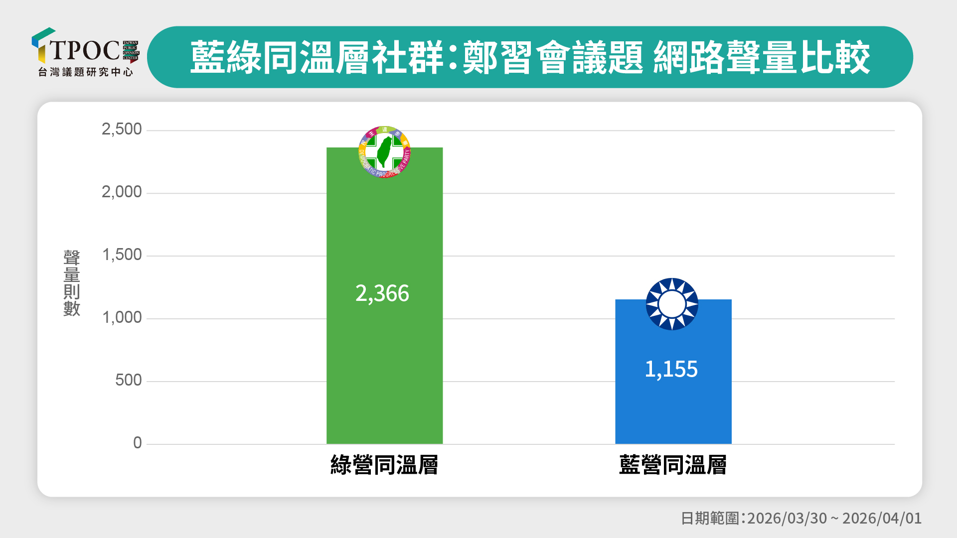 總結來看,即便目前整體網路輿情因中性聲量佔比極高而呈現「觀望」態勢,但從政黨同溫層的數據對比可以預見,4月份的兩岸議題對抗已來勢洶洶。特別是綠營社群的討論聲量已達藍營的兩倍,展現極強的攻擊意向;值得注意的是,此次綠營的空戰策略不再像往常僅是一味的「抹紅」,而是轉向更有感的「交作業」論述:要求鄭麗文在出訪前應先處理國內軍購、總預算與國安法案,將行程定調為「逃避作業」的行為。至於後續這套攻防模式將如何演進,以及藍營能否透過實際出訪內容進行防守反擊,仍待正式登陸後進一步的數據觀測。