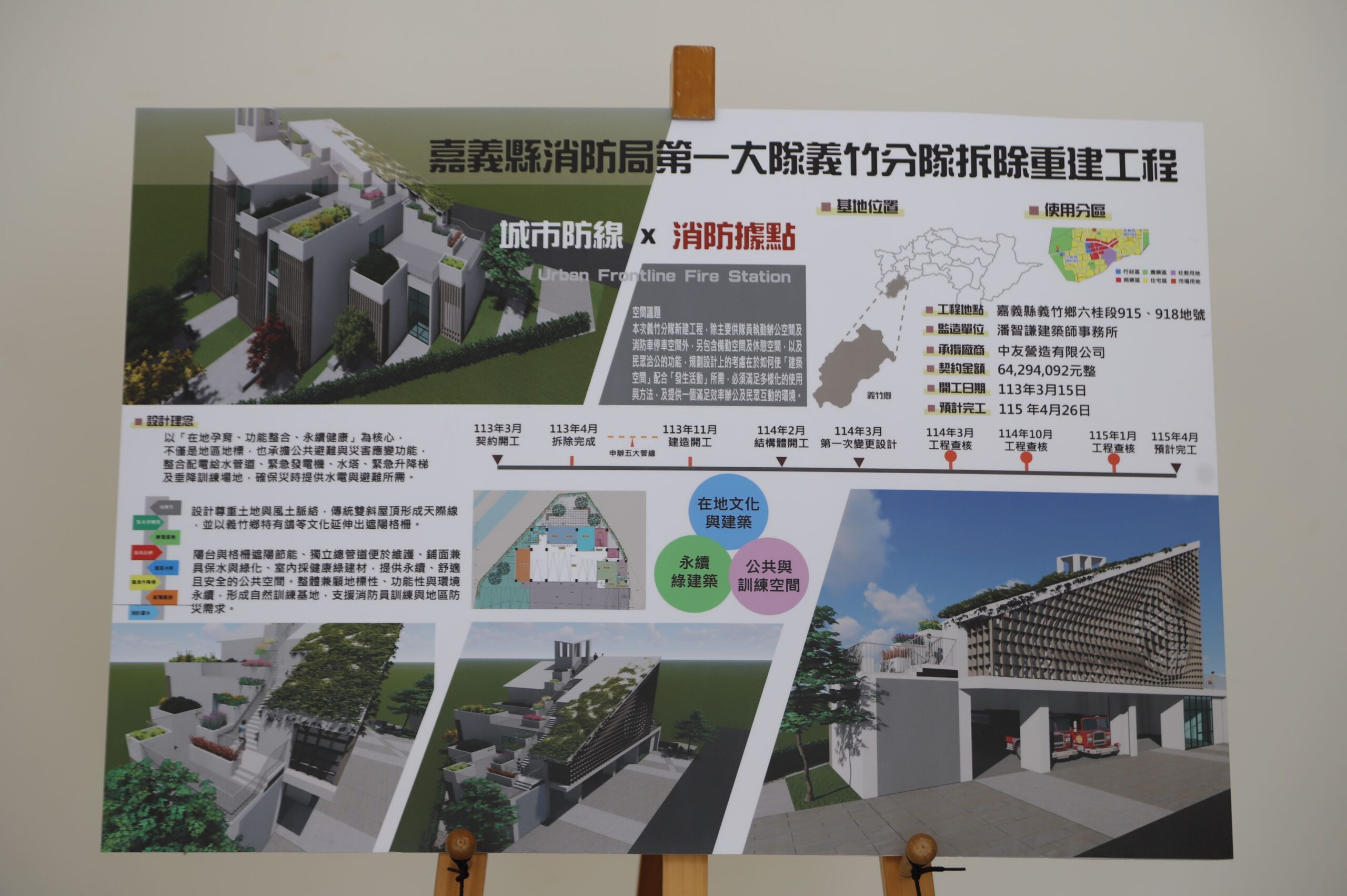 義竹消防分隊重建工程經費7,064萬9,471元(中央補助4,319萬1,900元、地方自籌2,745萬7,571元),由中友營造有限公司承攬施工,113年3月15日開工,預計今年4月底完工,基地位於嘉義縣義竹鄉仁里村,面積831平方公尺,總樓地板面積836.22平方公尺,為ㄧ地上3層的鋼筋混凝土建築物。