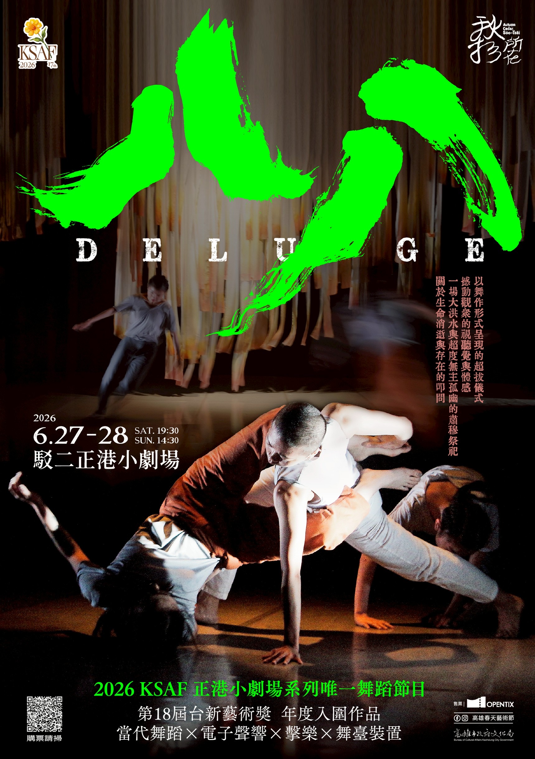 今年春藝小劇場系列舞蹈作品,由高雄當代舞團「秋杉所在」,主張以身體作為思考起點,透過舞蹈回應各式樣態的社會議題。將於6月27日至28日帶來曾入圍第十八屆台新藝術獎年度作品《八 八》。以2009年高雄甲仙撼動國內外的大洪水為背景,結合當代舞蹈、電子聲響、擊樂與舞台裝置,發展出一場具有儀式感的身體展演。創作團隊透過田野踏查與臺灣民間信仰中的「拔超科儀」,轉化為舞台上的動作語彙,使歷史事件不僅停留於再現,而成為對存在、消逝與土地記憶的深層提問。《八 八》不以悲情回顧災難,而是在身體與聲響的流動之中,傳遞對生靈與土地的感念。