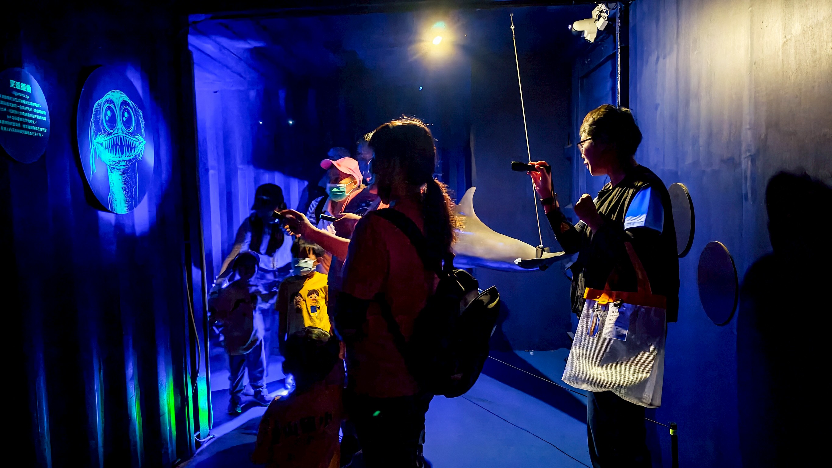 第一階段【格物】:紫光探照深海無光帶─踏入伸手不見五指且低溫的展館,觀眾將握著工作人員遞來的紫光燈,在花了一點時間適應光線與溫度後,於隱約的空間輪廓中四處搜尋。藉由「現象觀察(格物)」的精神,民眾將赫然發現蟄伏在幽冥深海裡的奇異生物,如以光作誘餌的巨棘角鮟鱇、站著等待掠食的三腳架魚,親身感受海平面下1,000公尺高壓、冰冷且永恆黑暗的極限環境,如何驅動生物演化出特殊的生態結構與捕食本領。