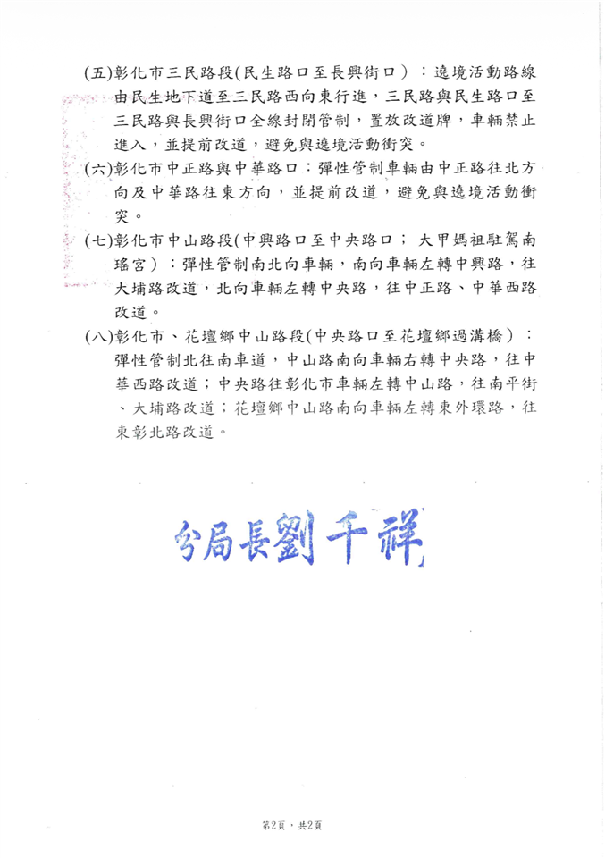五、彰化市三民路段(三民路與三民路237巷、三民路與三民路249巷、三民路與三民路250巷、三民路與三民路279巷、三民路與長興街):4月18日21時至2時進行管制,民生地下道大甲媽祖遶境路線由西向東行進,三民路與民生路口至三民路與長興街口全線封閉,置放改道牌,車輛提前改道避免與遶境路線衝突。