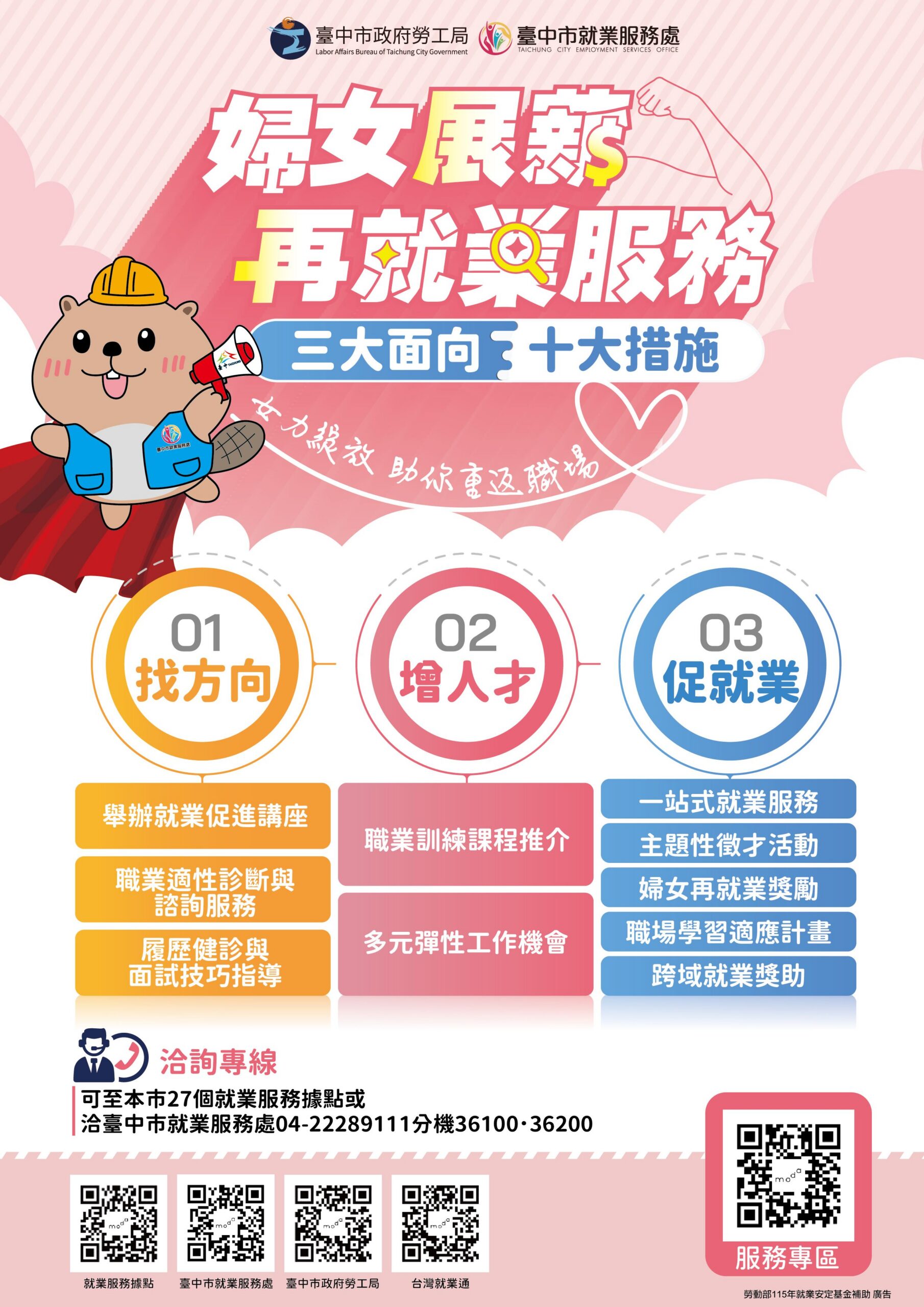 台中市就業服務處補充,若想了解更多婦女就業資訊,歡迎參考「婦女展薪再就業服務專區」(https://gov.tw/MH6),另外也有辦理多場徵才活動,如有需求歡迎至熱門活動專區(https://gov.tw/XJo)。