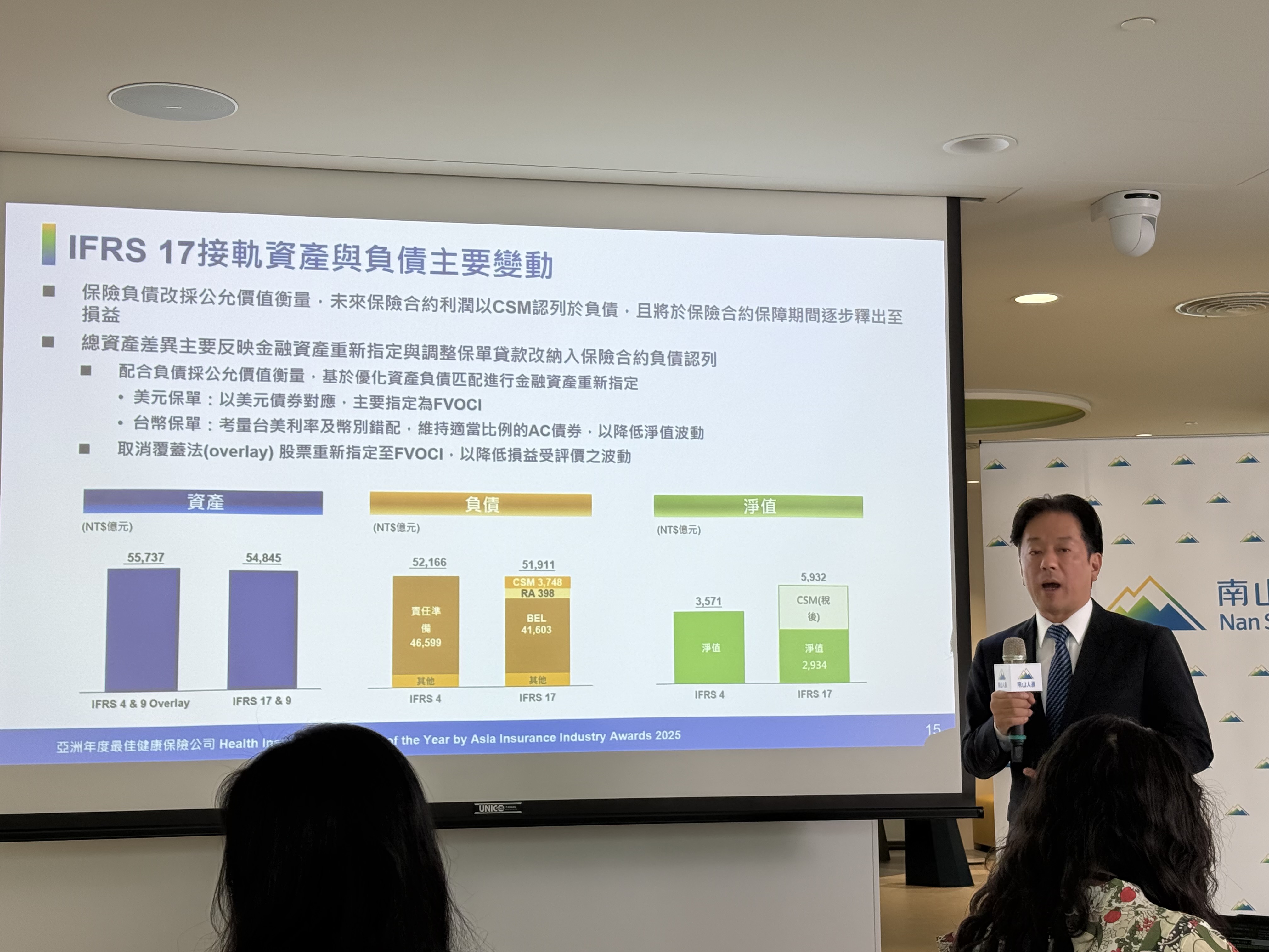 南山人壽今天也揭露了接軌國際財務報導準則第17號「保險合約」(IFRS17)後最新財務數字,財務長蔡昇豐指出,接軌後,CSM(合約服務邊際,亦即保險合約未來的利潤)餘額達3748億元,將於保險合約保障期間逐步釋出至損益,CSM釋出後也可透過新契約貢獻持續成長。