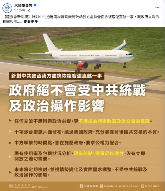 陸委會16日在臉書回應陸方要求全面恢復兩岸客運直航。(大陸委員會臉書)