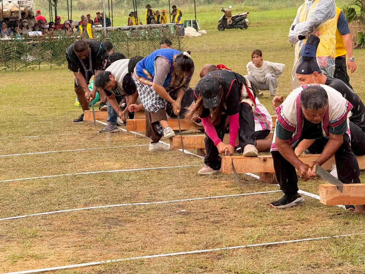 除了祭儀演繹,現場的傳統技能競賽更是力與美的傳承舞台。競賽項目涵蓋傳統狩獵演示、摔角、鋸木、搗米及負重接力,並特別劃分國小組與社會組,讓山林智慧在競技中完成世代交替。參賽者展現出的強悍體能與精湛技巧,伴隨著部落鄉親震耳欲聾的加油聲,不僅具體實踐了布農族的剛毅精神,更讓觀禮民眾深刻感受到原民文化在年輕一代身上紮根的具體成果。
