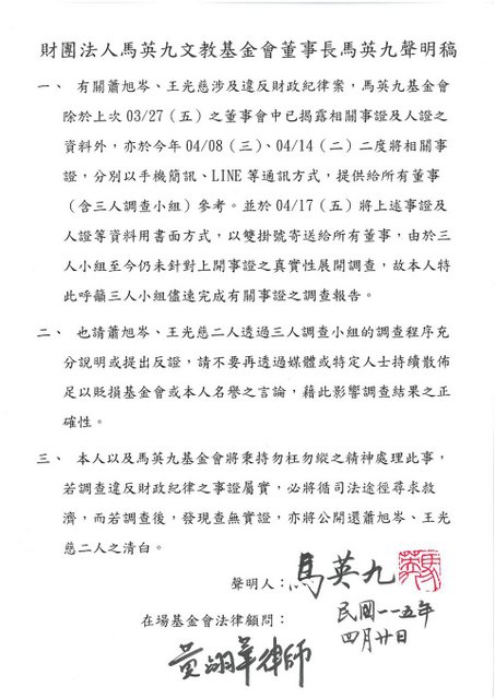 綜合報導/馬英九基金會風波仍未平,針對中國國民黨副主席蕭旭岑、王光慈違反財政紀律案,基金會董事組三人調查小組,不過調查小組日前質疑基金會未提供相關資料,基金會今20日再發聲明,稱17日已經寄雙掛號給所有董事,呼籲三人小組儘速完成有關事證之調查報告。三人小組成員李德維今天表示,17日到今天隔一個周末,還沒收到,在急什麼,“郵局你家開的?”,請“真正的聲明人”稍安勿躁。 馬英九基金會再發聲明,以董事長馬英九署名聲明人發出,指有關蕭旭岑、王光慈涉及違反財政紀律案,馬英九基金會除於上次3月27日之董事會中已揭露相關事證及人證之資料外,亦於今年4月8日、4月14日二度將相關事證分別以手機簡訊、LINE等通訊方式,提供給所有董事(含三人調查小組)參考。並於4月17日將上述事證及人證等資料用書面方式,以雙掛號寄送給所有董事。 聲明指出,由於三人小組至今仍未針對上開事證之真實性展開調查,特此呼籲三人小組儘速完成有關事證之調查報告。也請蕭旭岑、王光慈二人透過三人調查小組的調查程序充分說明或提出反證,請不要再透過媒體或特定人士持續散佈足以貶損基金會或馬英九本人名譽之言論,藉此影響調查結果之正確性。 ![]() 聲明強調,馬英九以及馬英九基金會將秉持勿枉勿縱之精神處理此事,若調查違反財政紀律之事證屬實,必將循司法途徑尋求救濟,而若調查後,發現查無實證,亦將公開還蕭旭岑、王光慈二人之清白。 對此,三人小組之一的李德維直斥無聊,請“真正的聲明人”稍安勿躁,他聲明寫17日週五才寄出,中間隔一個週末,今天就發聲明要人啟動調查,目前還沒收到,他們自己收到雙掛號回條了沒?還沒收到在急什麼,“郵局你家開的嗎?” 李德維強調,調查小組是由董事薛香川召集,自己會審視基金會所提供的資料並約談相關人士說明,調查小組會照該有的步調進行調查,世界不是繞著“真正的聲明人”轉的。 |