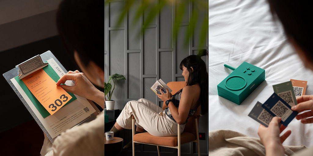 聽覺與書香:客房配置法國設計品牌LEXON —TYKHO 3 經典收音機藍牙音響,播放由爵士女伶 Francis Tsai 法蘭 及台中三間指標性唱片行(元氣、藍色、老頭)共同推薦的專屬歌單。房內備有作家 旅男 dato 推薦的清邁主題書籍,讓旅人在房內即可展開心靈漫遊。