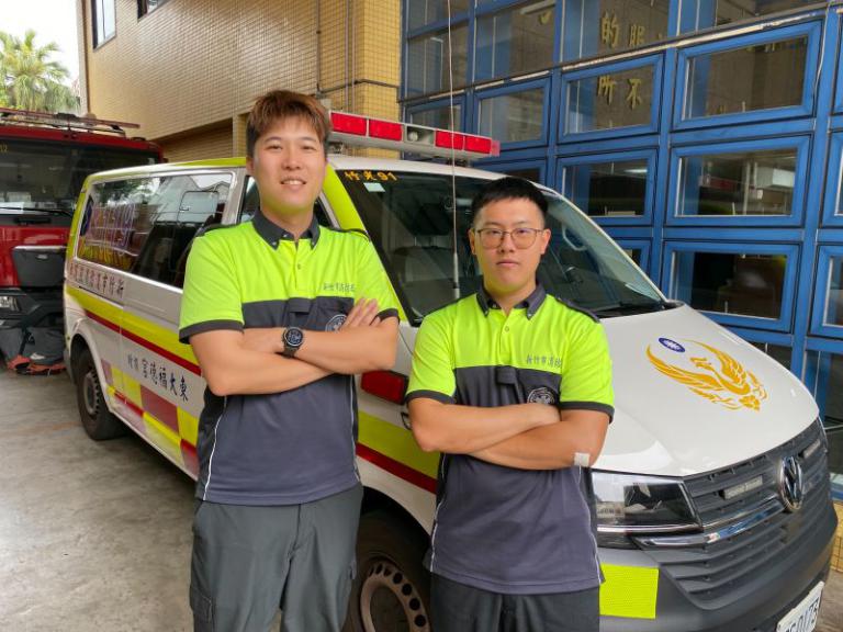 ▲竹光分隊消防員黃泰庭(左)、胡乃元執行救護成功救回患者。(圖/記者蔣彤雲攝)