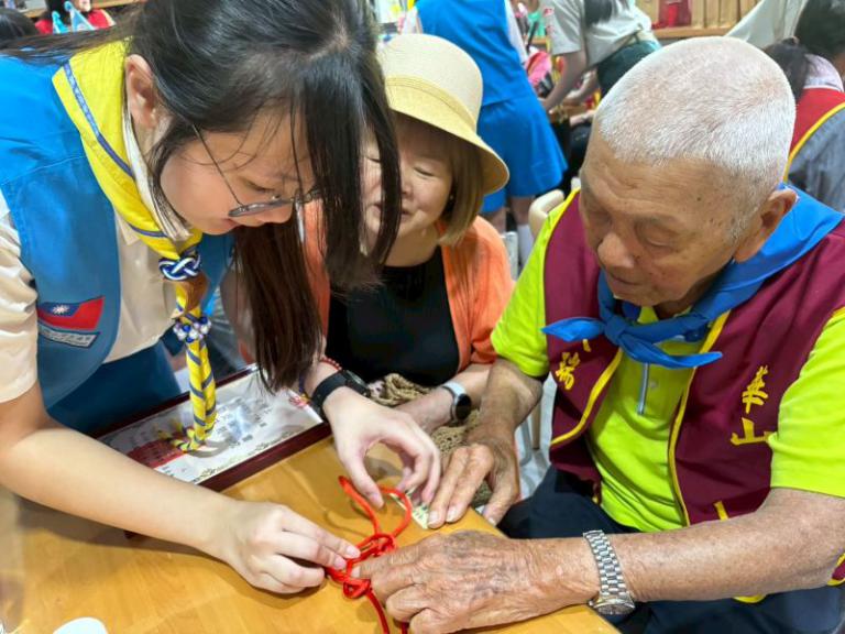 ▲童軍團孩子帶百歲宋增土阿公做中國吉祥結。(圖/記者蔣彤雲攝)
