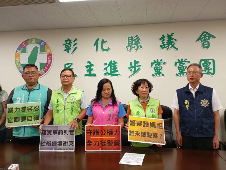 ▲大甲媽祖遶境行經彰化期間,接連爆發兩起嚴重衝突事件,導致3名警察受傷,彰化縣議會民進黨黨團21日召開記者會,嚴正譴責暴力行為無視法治,並表達對第一線執勤員警的全力支持。(圖╱記者孔亮云攝)