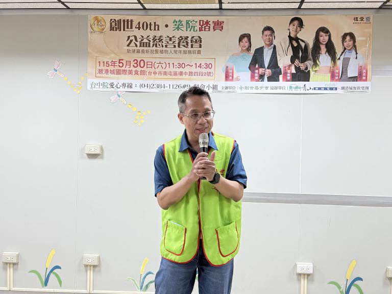 ▲創世台中院陳韋龍院長期盼企業、社團及社會大眾能踴躍認助餐桌/券,幫助嘉義新院順利建成。(圖╱創世基金會提供)