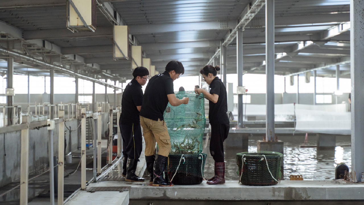 日運案場採戶外與室內並行的多元養殖模式,戶外池養殖烏魚與虱目魚,並混養白蝦維持池底生態平衡;其中烏魚每年投入約14至15萬尾,透過益生菌養殖管理優化水質,並於年底加工製成烏魚子,提升產品附加價值。室內設施則導入高密度白蝦養殖,每年投入約270萬尾白蝦苗,結合生物絮團技術,建立穩定且具韌性的養殖環境,有效降低氣候變動風險。全數漁產品皆取得產銷履歷認證並符合臺灣良好農業規範(TGAP),同時已申請並通過多項養殖相關技術專利,涵蓋養殖結構與捕撈系統等,持續優化養殖效率與管理能力。