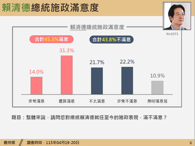 45.3%受訪者對於賴清德施政感到滿意。(照片:《震傳媒》提供)