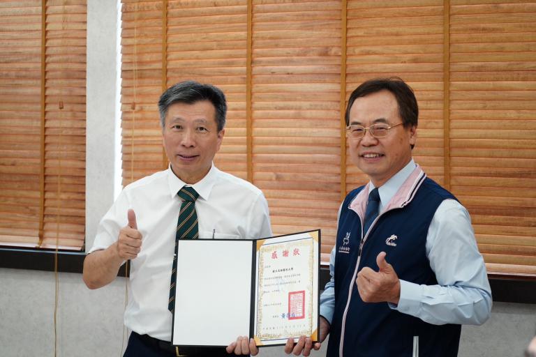 ▲社團法人中華肉品協會黃存后理事長贈感謝狀給高餐大方德隆校長。(圖/高餐大提供)